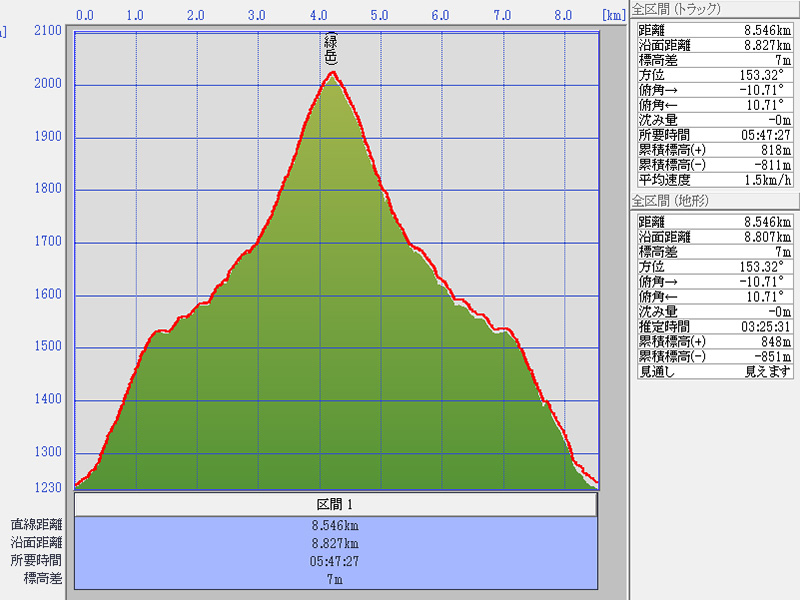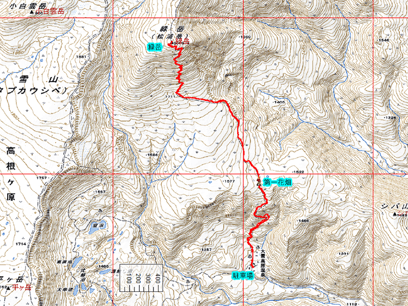 銀泉台から緑岳山頂を往復しました。 駐車場 06時37分 第一花畑 07時25分 (0時間48分) 山頂着 09時33分 (2時間08分) (2時間56分) 山頂発 10時00分 (0時間27分) (0時間27分) 駐車場 12時24分 (2時間24分) (2時間24分) 合計所要時間 5時間47分 (GPS記録) 総上昇量 m 総下降量 m 累積標高(+)トラック 818m 累積標高(+)地形 848m TP積算距離 8.8km (メモ) カメラ・紅葉綺麗