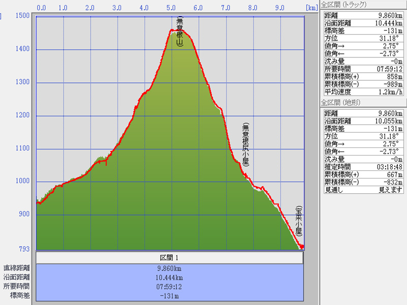 グラフは、2回目の沢登り開始地点〜宝来小屋。