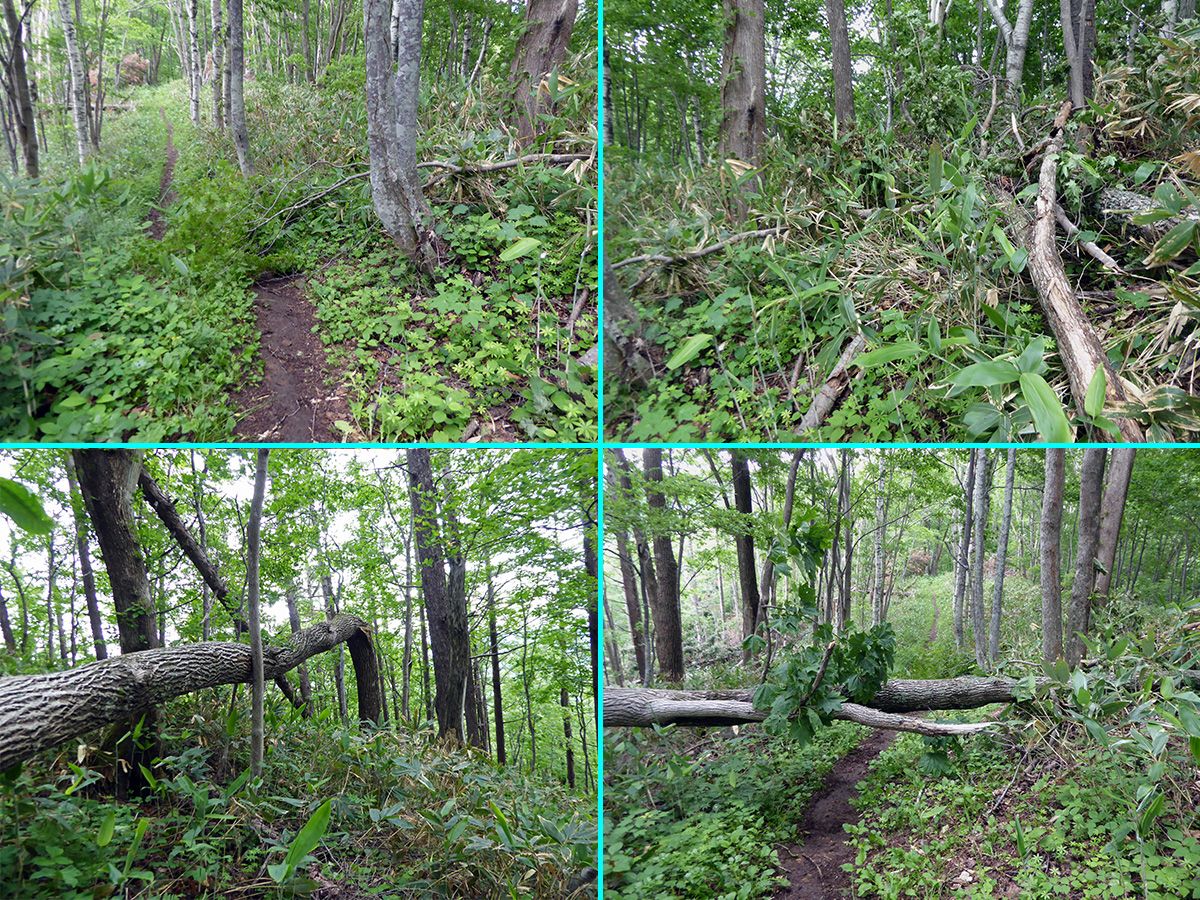 登山道を横断しているこの倒木は、上を跨いで越えるのには高すぎ、下をくぐるには少し狭い感じです。