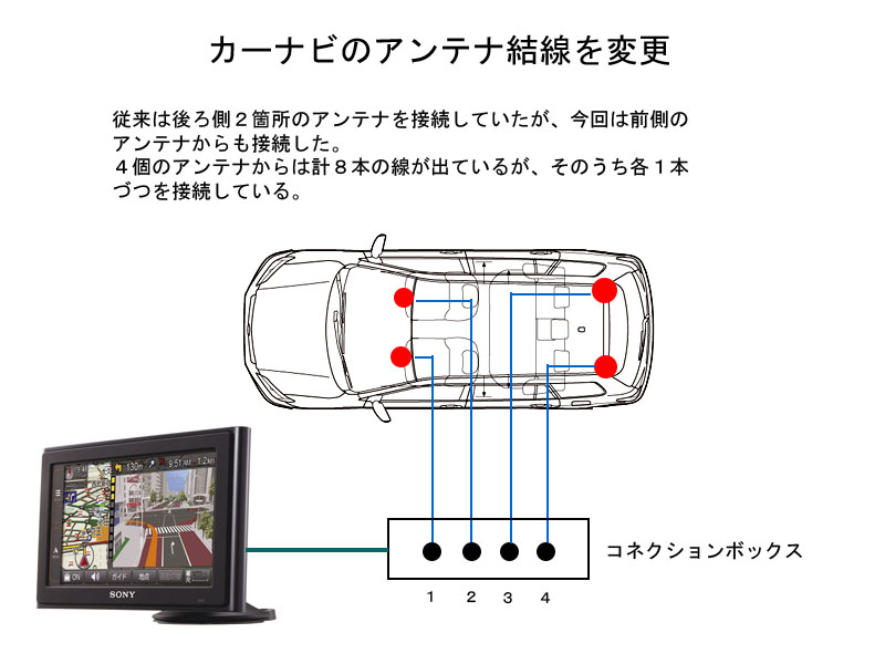 アンテナ線を集約するコネクションボックスは、1〜4のアンテナ線を常時監視していて、リアルタイムで一番強い電波を受信しているアンテナ線を利用します。