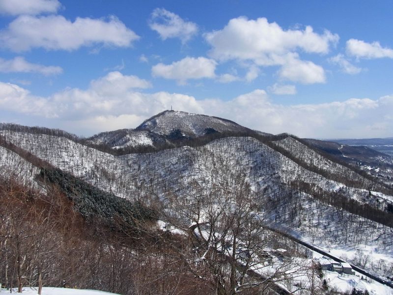 山頂展望台の裏側(市街地側)に着いたとき、私を追い抜いて行った若い登山者が「カリントウ」を食べていました。