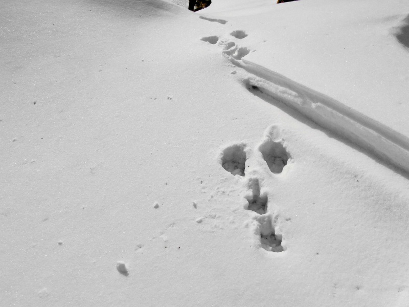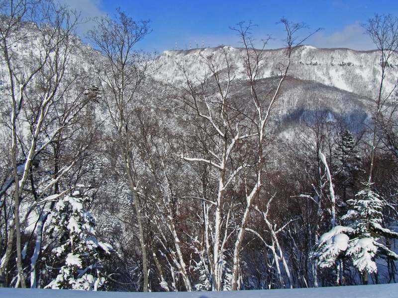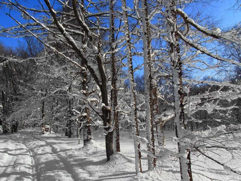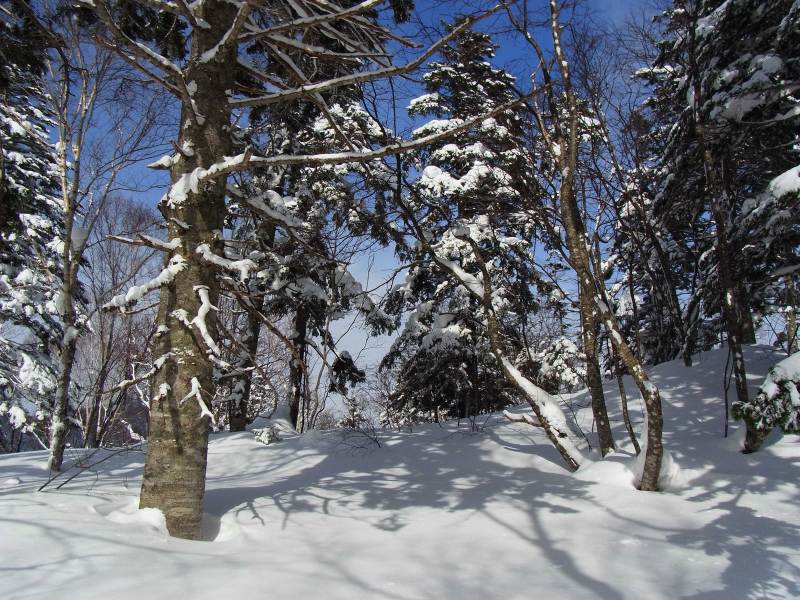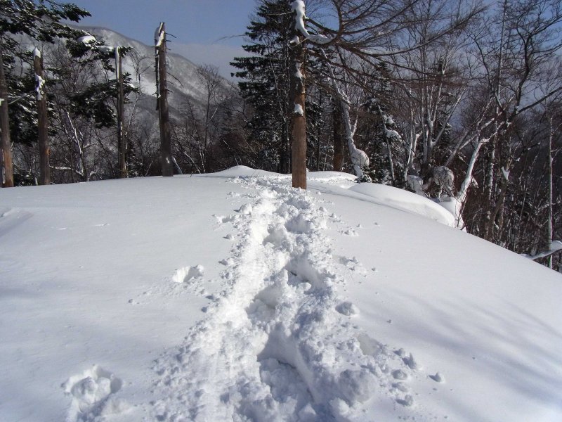 何時も直登している急斜面のひとつでは、新雪が深くて時間が掛かりそうだったので、傾斜の比較的緩い夏道コースを歩いてピークまで登りました。