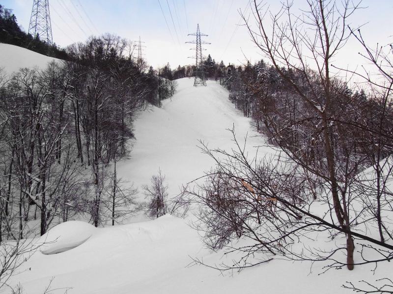 今日は、この急斜面の2/3程度下った所で12時近くになったので、そこで昼食を摂り引き返すことにしました。