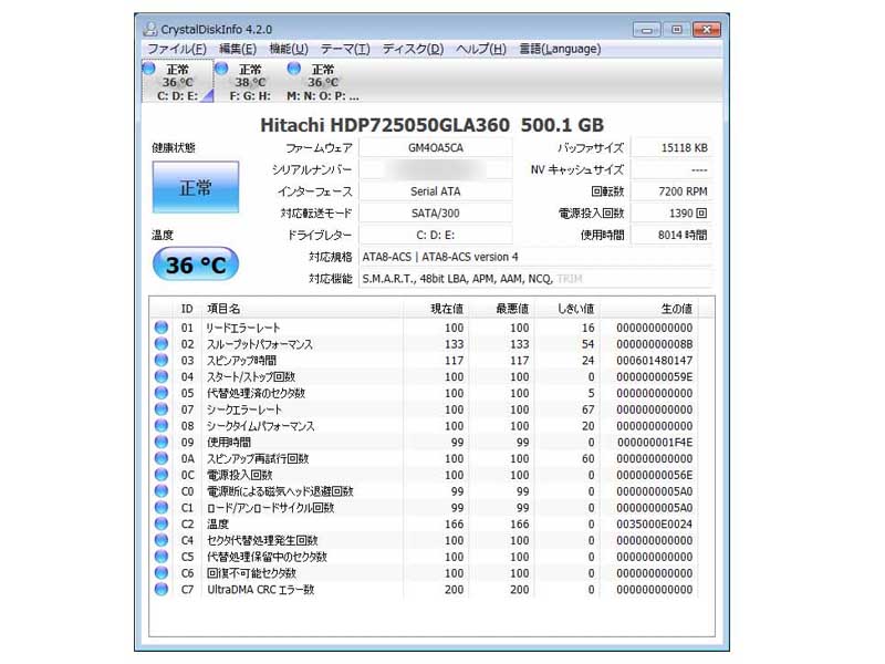 ソフト名は、「CrystalDiskInfo」で、結構有名なフリーソフトです。
