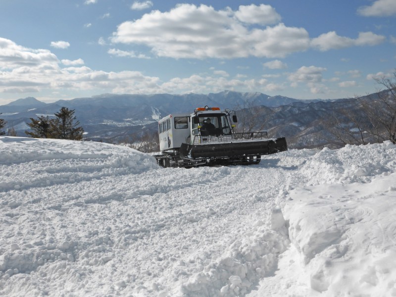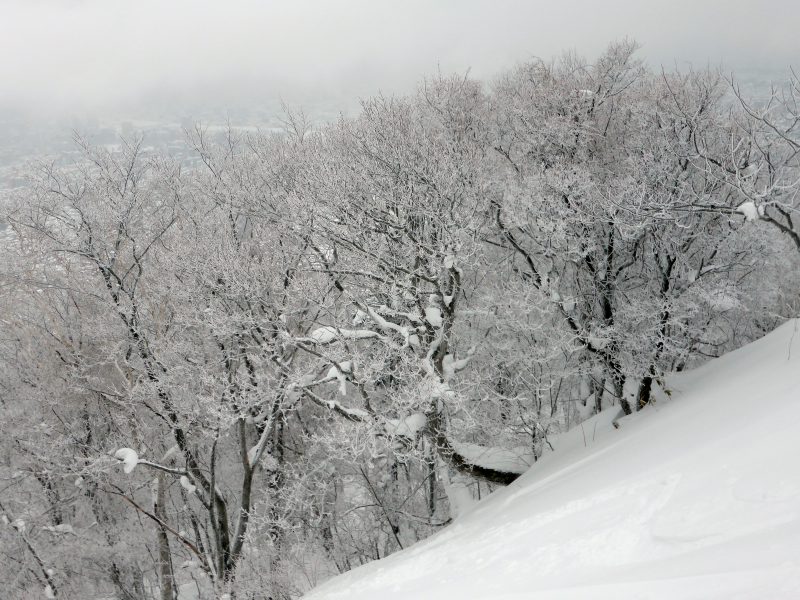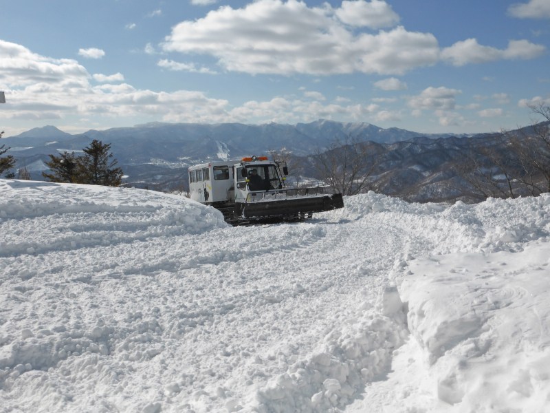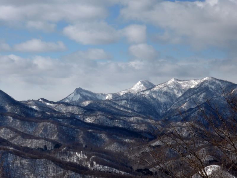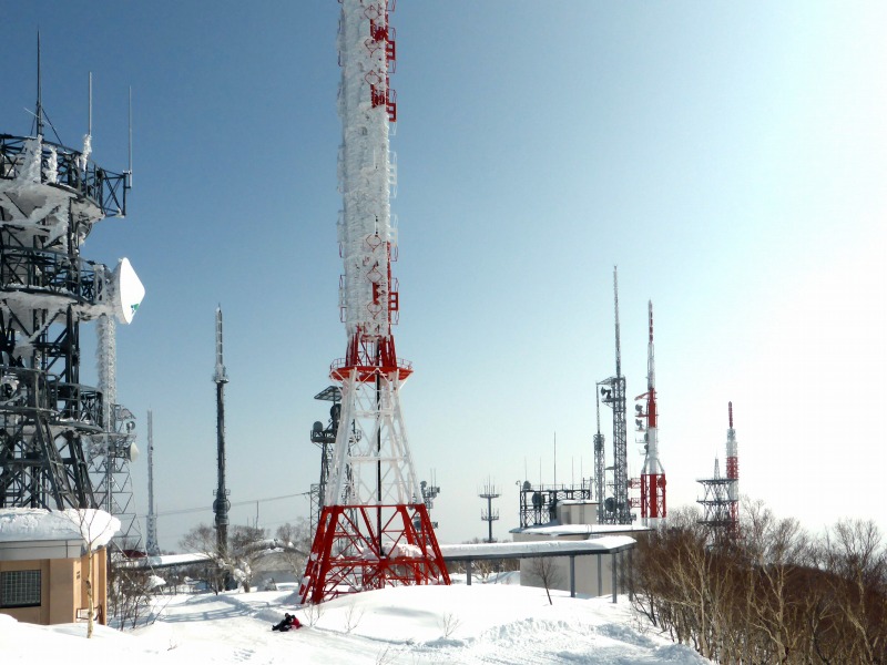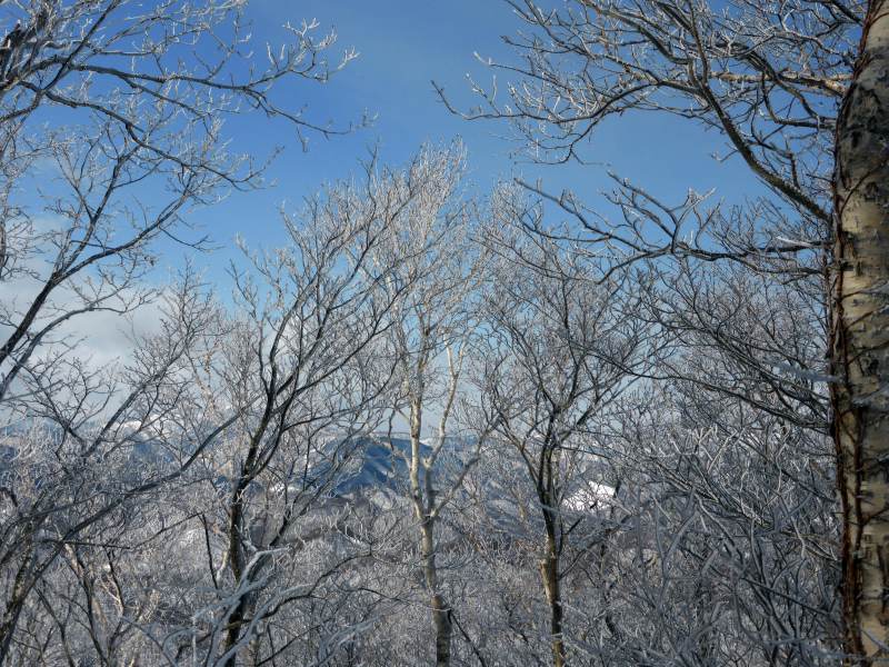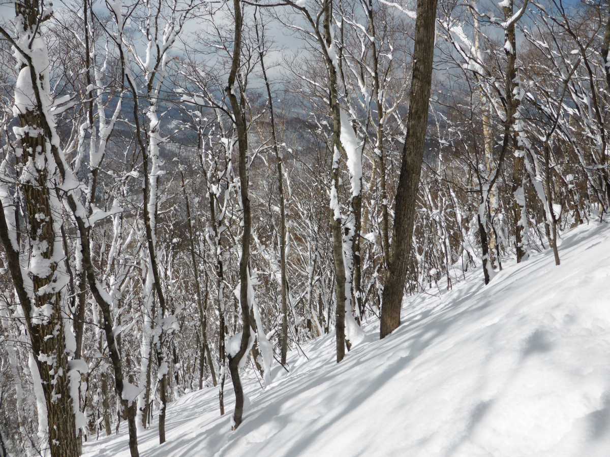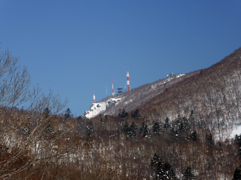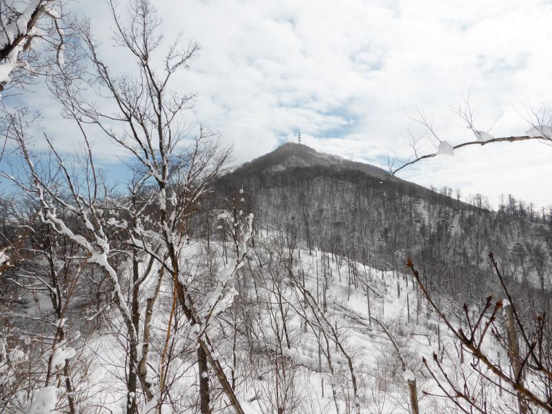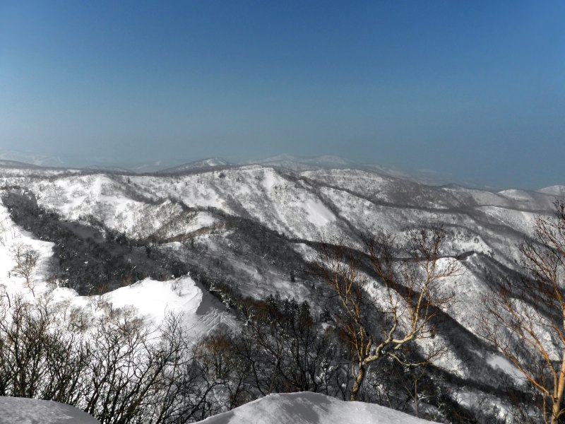 気温が上がってきたため、遠方視程はやや不良でしたが、山頂から見える近くの山の斜面には、スキーの跡が残っていました。
