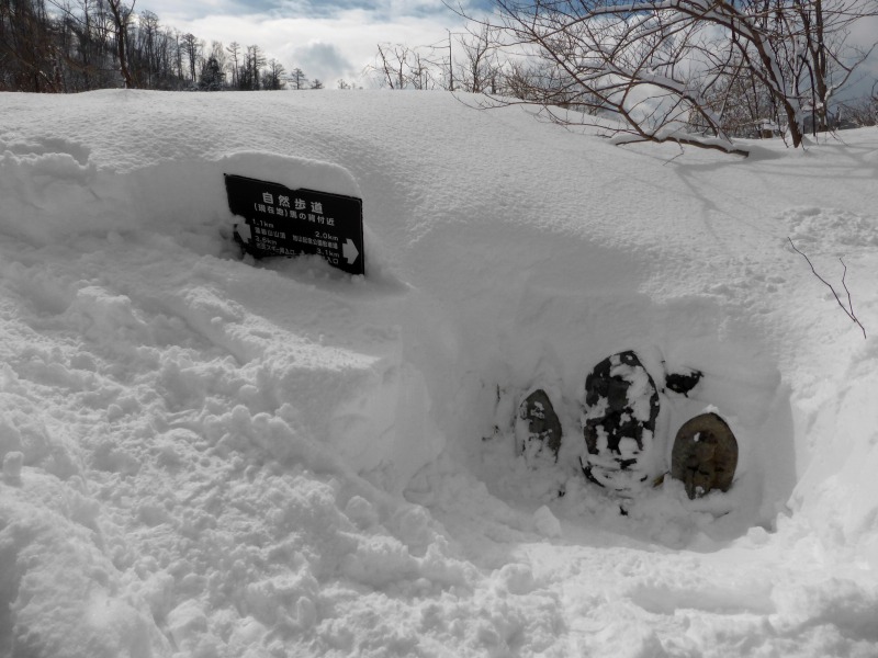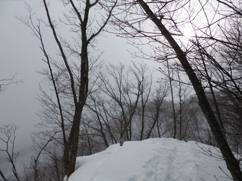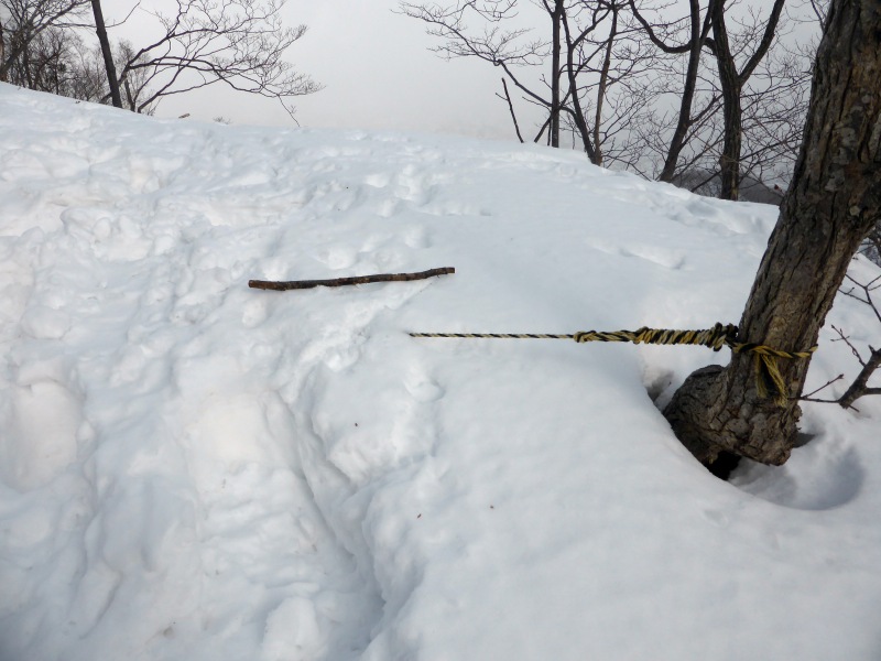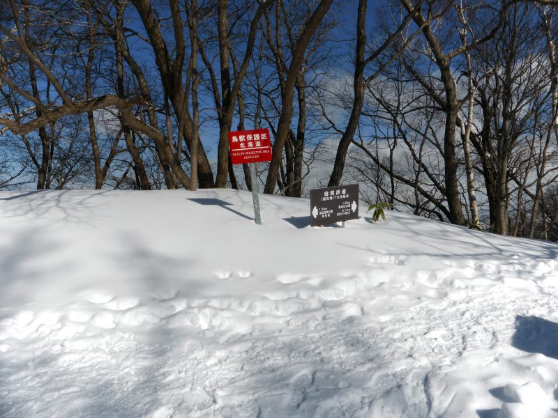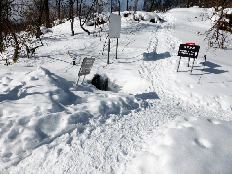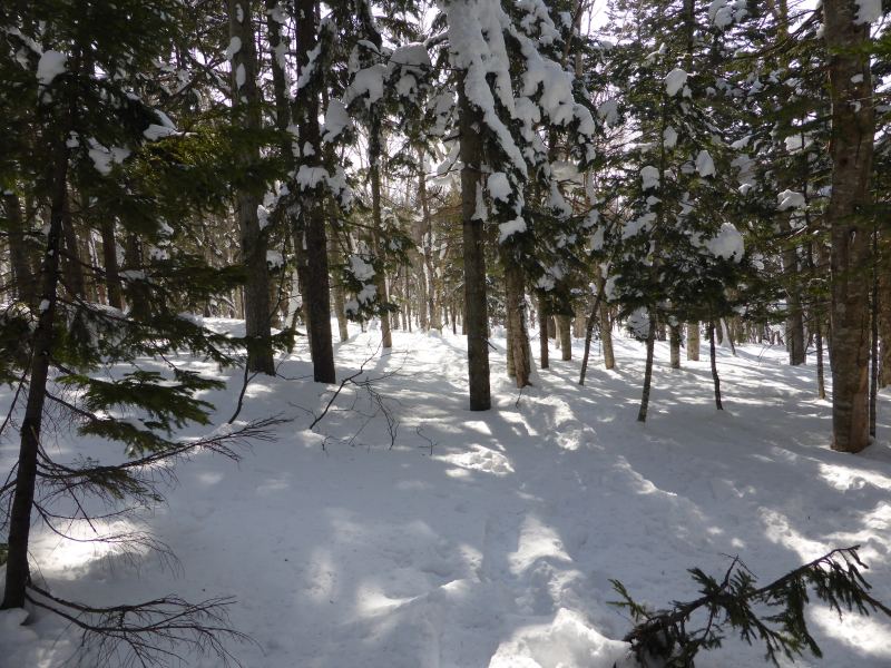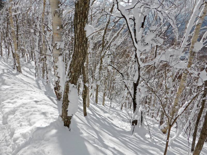 今日の登山道の状態は、暫く降雪が無かったようで、冬道の急登部分とガレ場では、スノーシューの踏み跡が広範囲に広がり、藻岩山についている様な凹型の踏み跡が全くない状態でした。