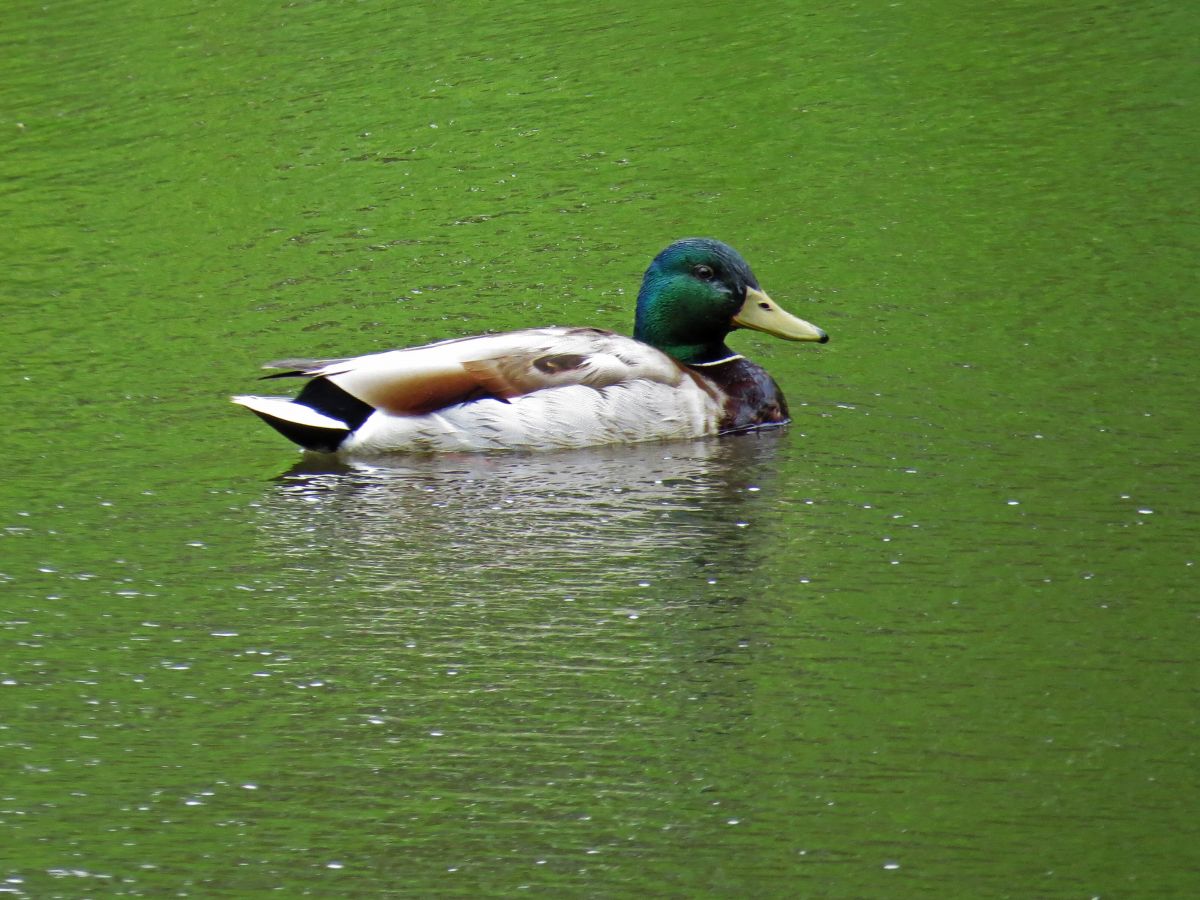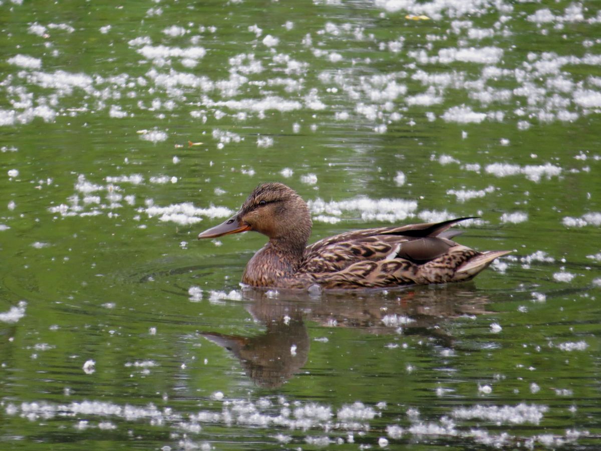 人工池では、マガモが一羽採餌をしていました。