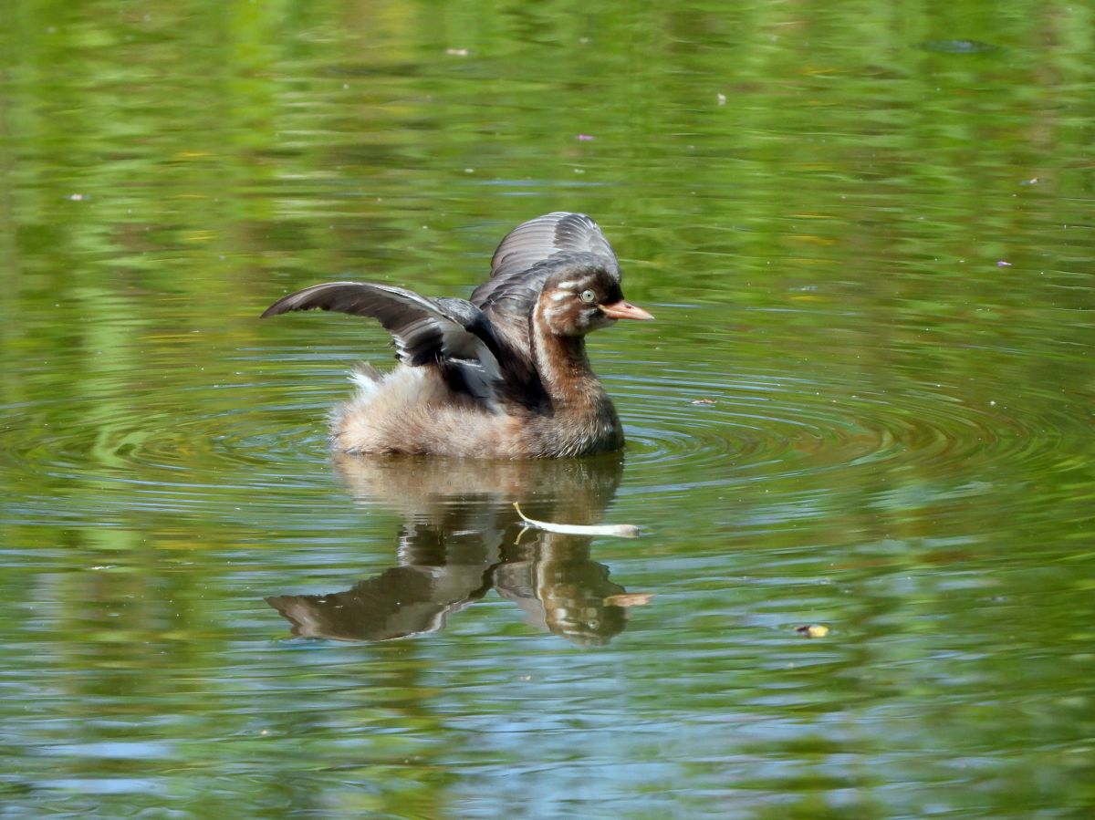 カイツブリの幼鳥は、羽根を拡げたり閉じたりしながら、羽根の手入れをしていました。(写真5,6)