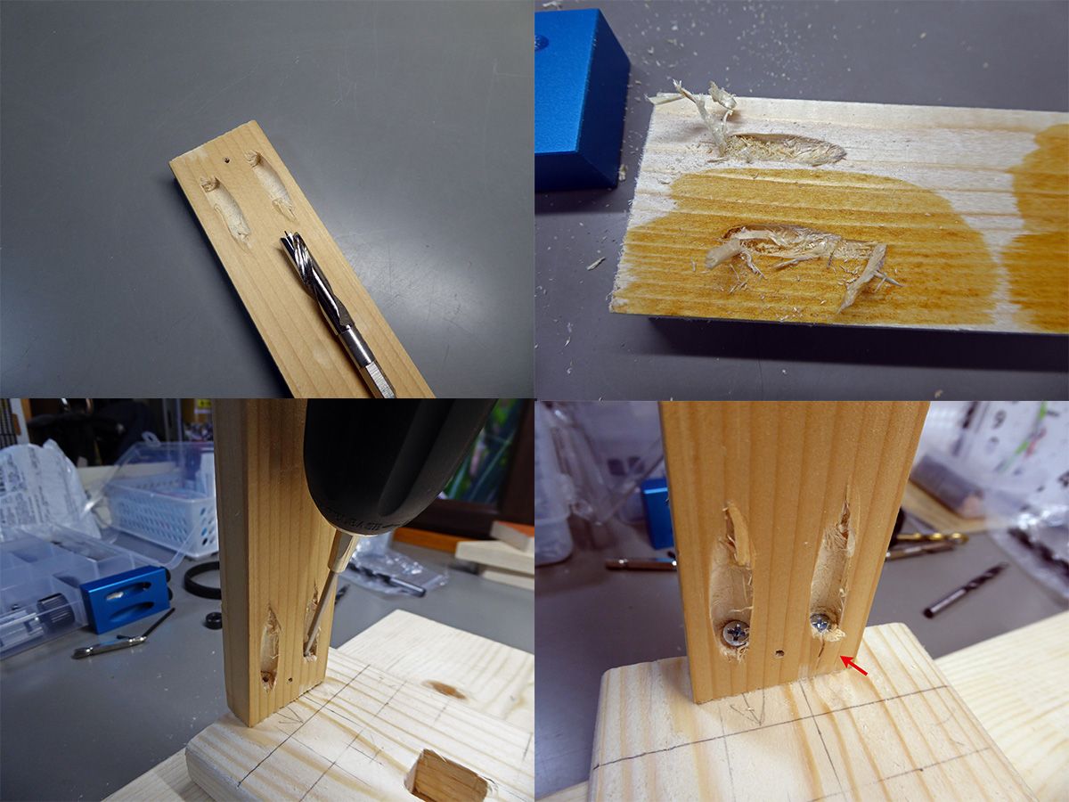 治具をトリマー台に固定するネジ取り付け部分が、木材の材質が弱くネジの圧力に耐えられませんでした。