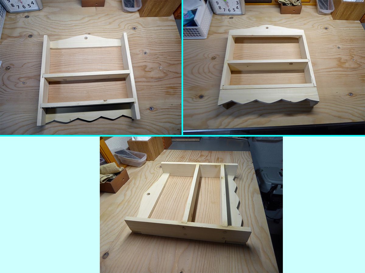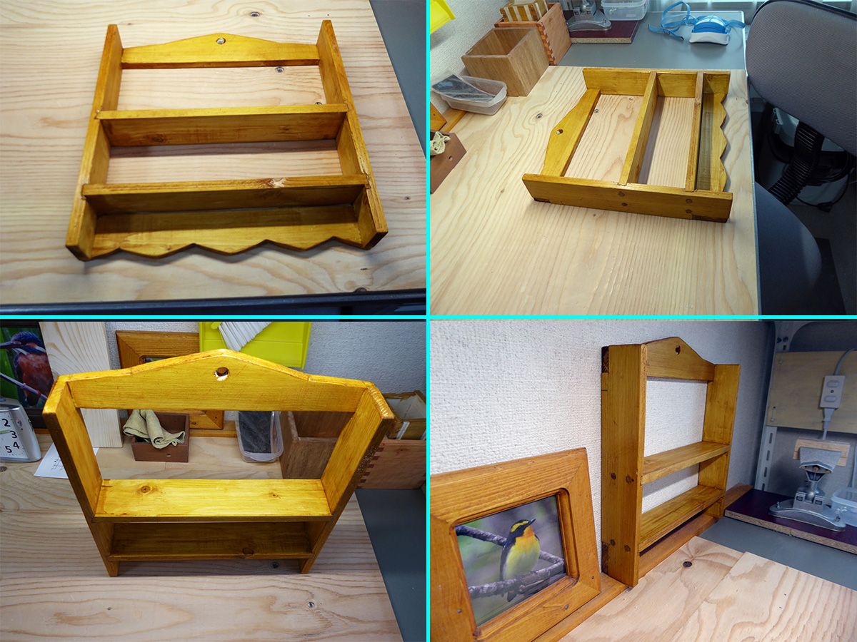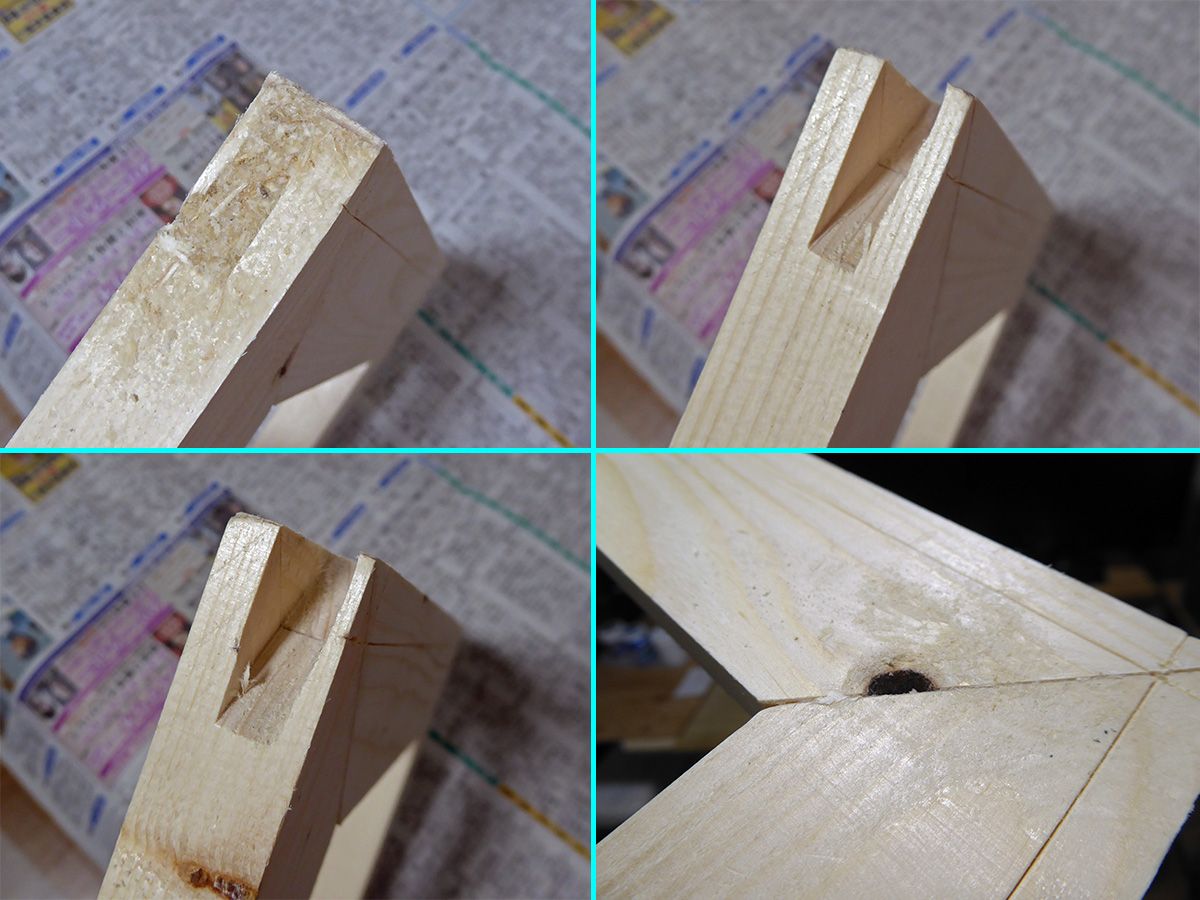 違いは、材料の正確な切断、木材の平滑化の度合い、側板に棚板を取り付ける場所の「大入れ組み手」の正確性などで、まだまだ練習をしないといけませんね。
