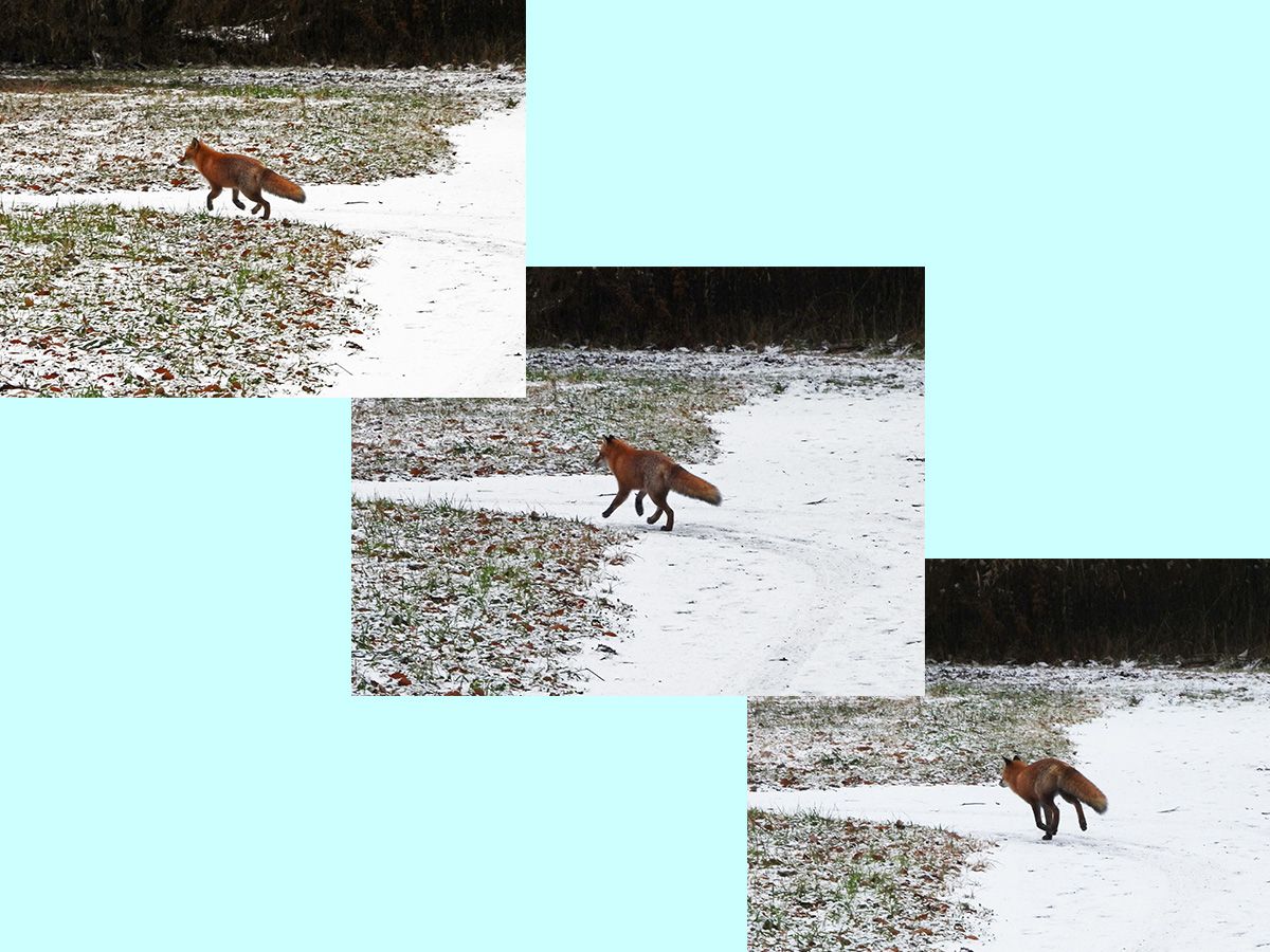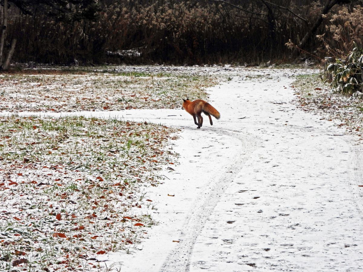 その後、大分近づいてからキタキツネが気がついて立ち止まりました。(写真4)
