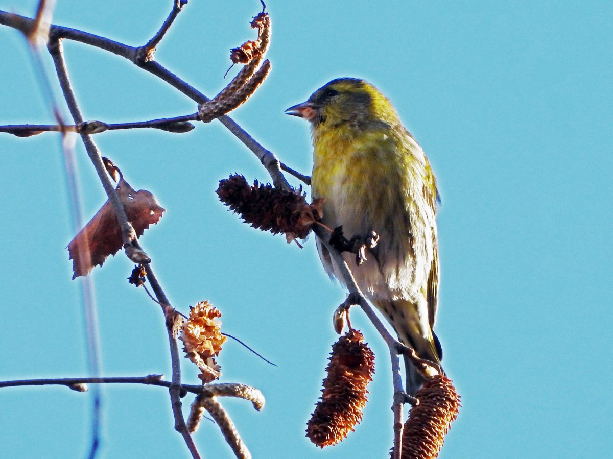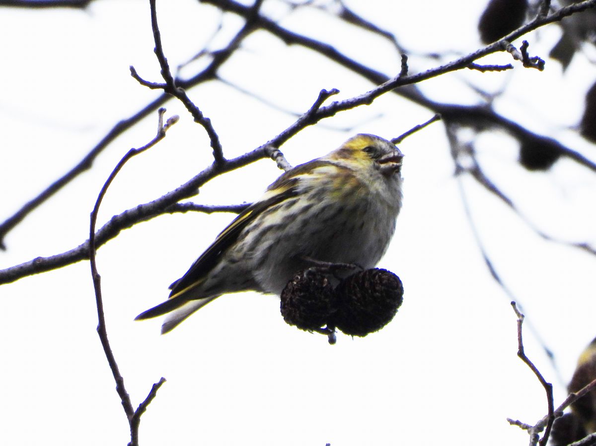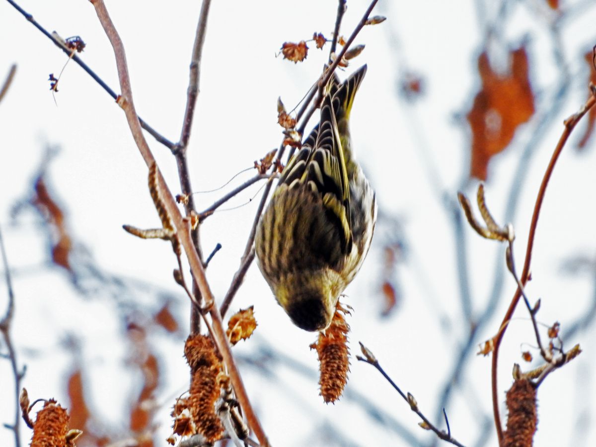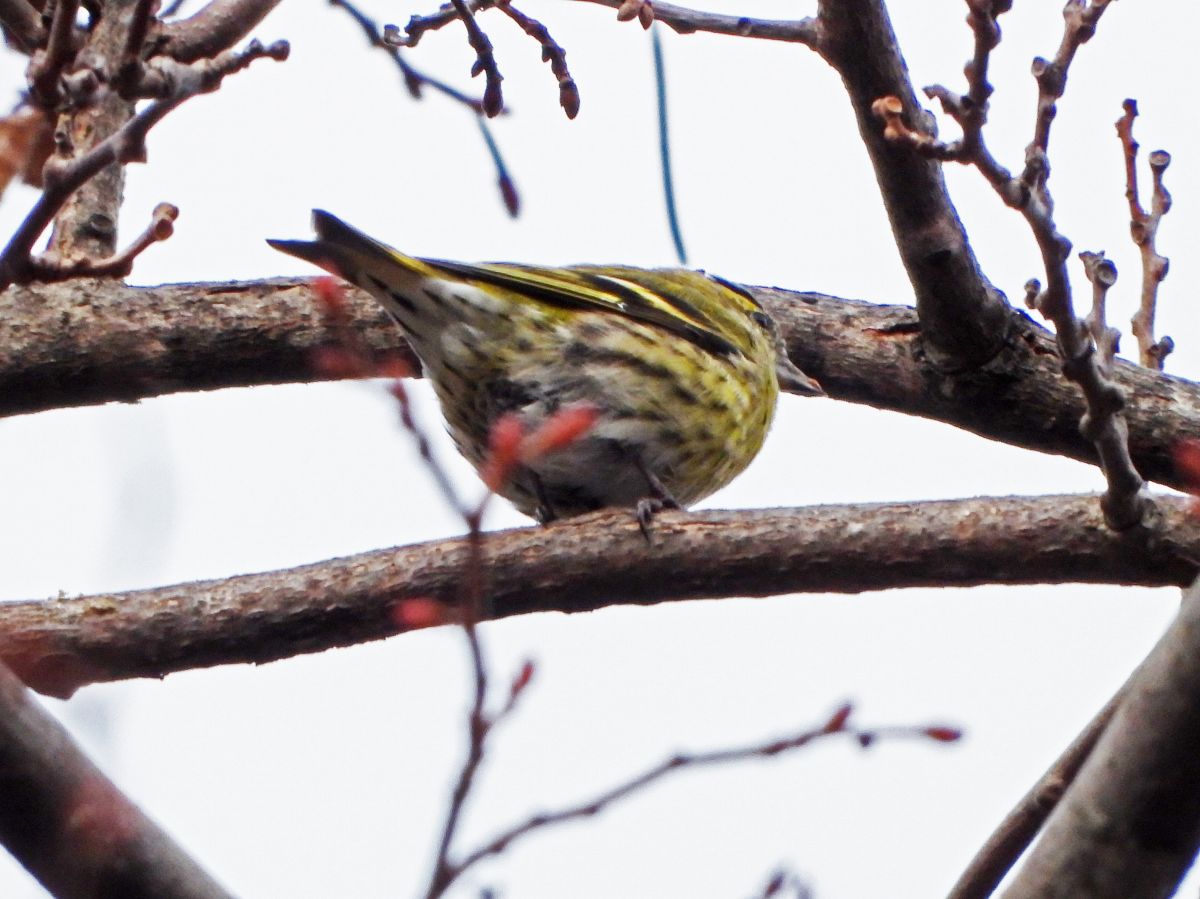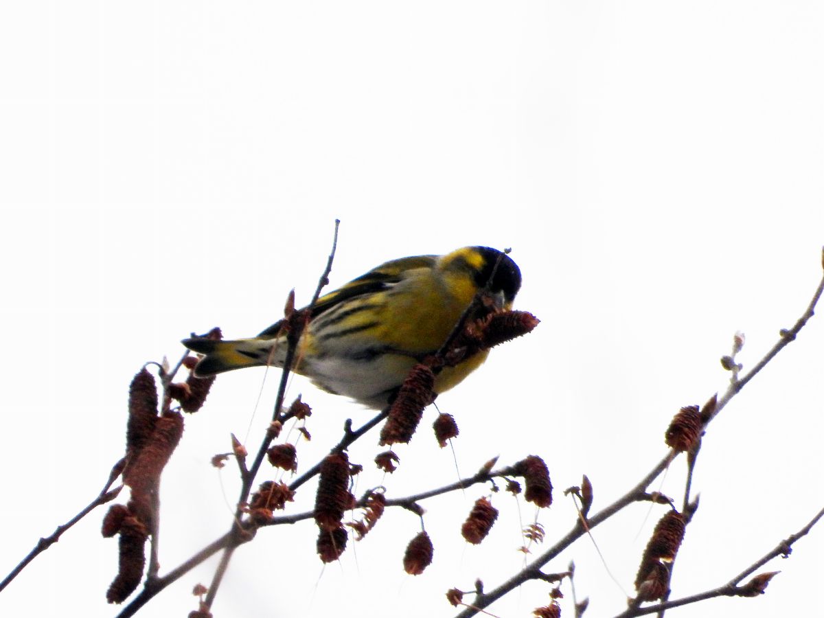 マヒワは、高木の梢部分で採餌をするため、殆ど下には降りてきません。