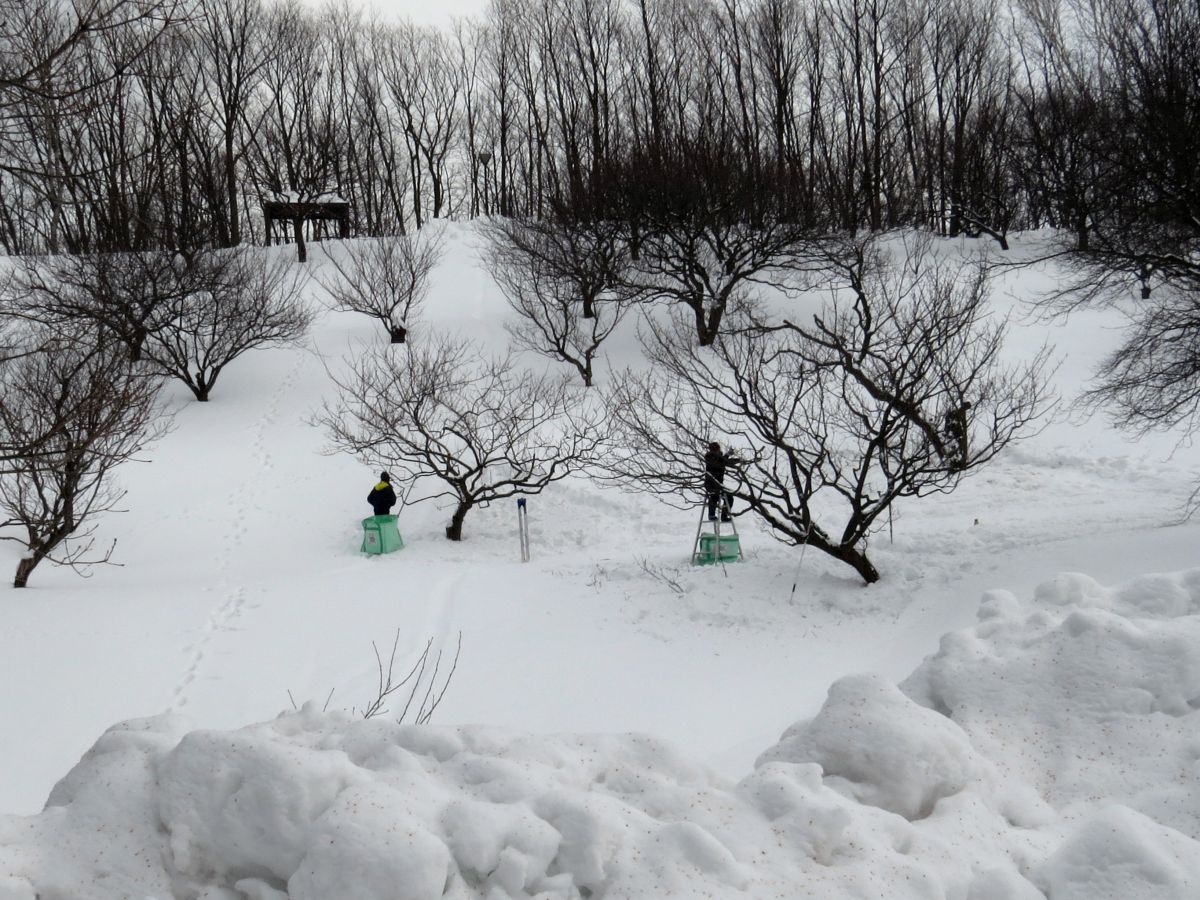 最近は時々気温が上がって木道上の雪を減らしていましたが、梅林では今冬の最深積雪になったと思われます。(写真1)