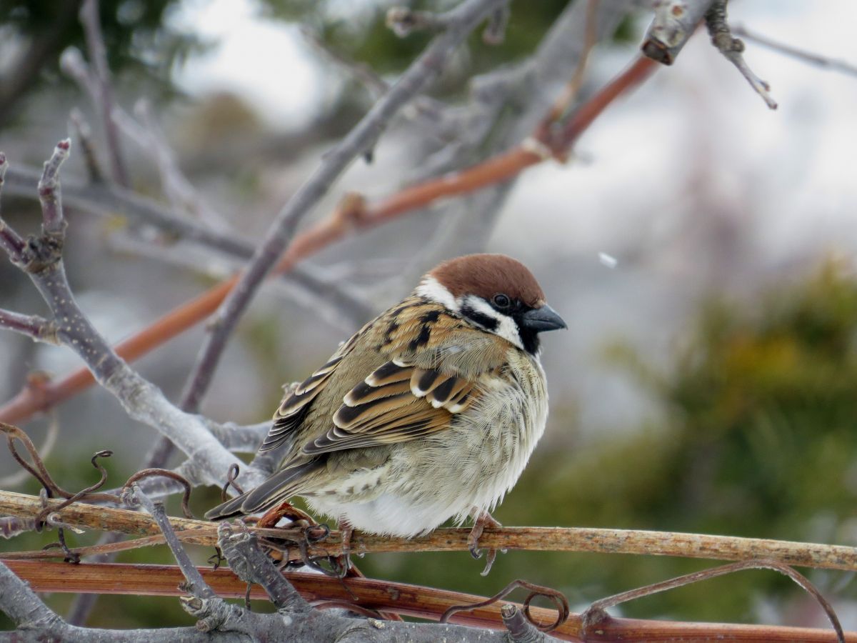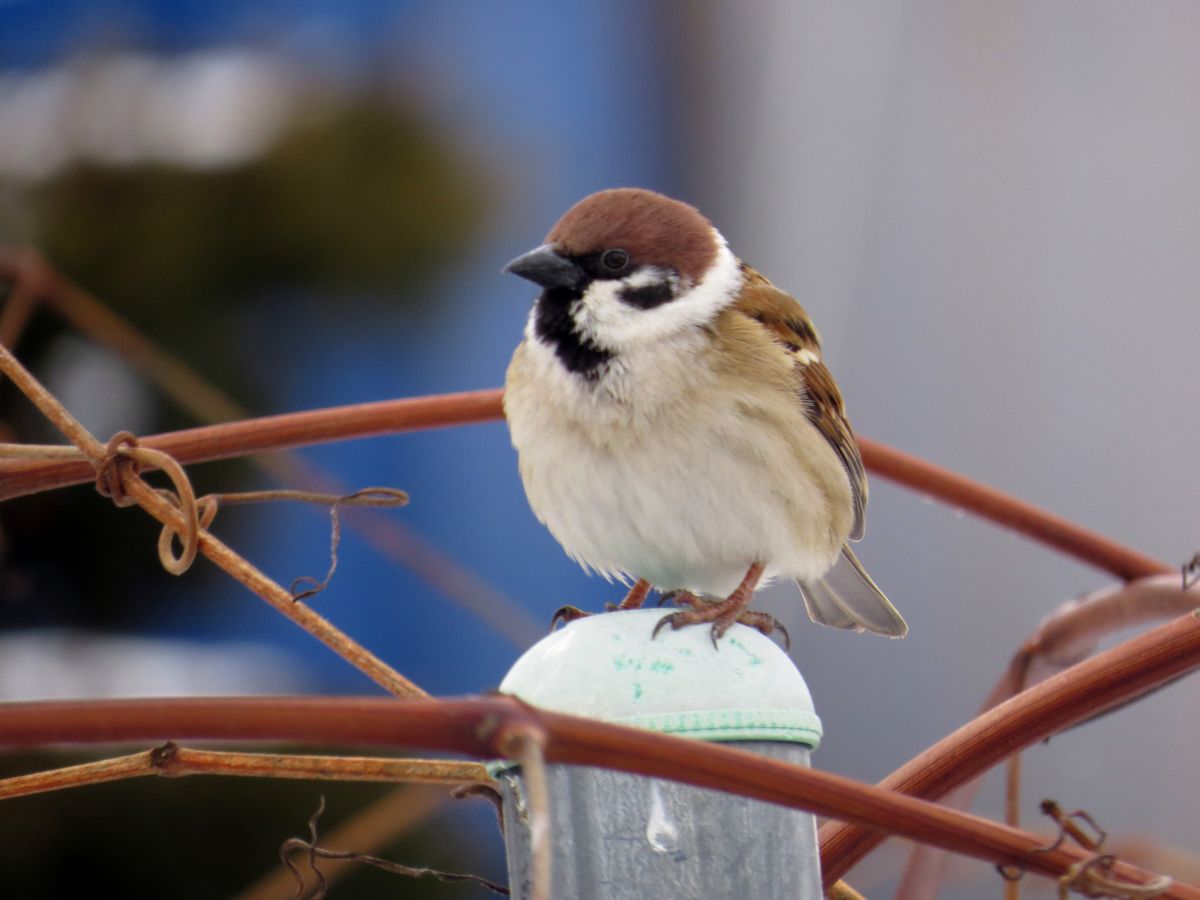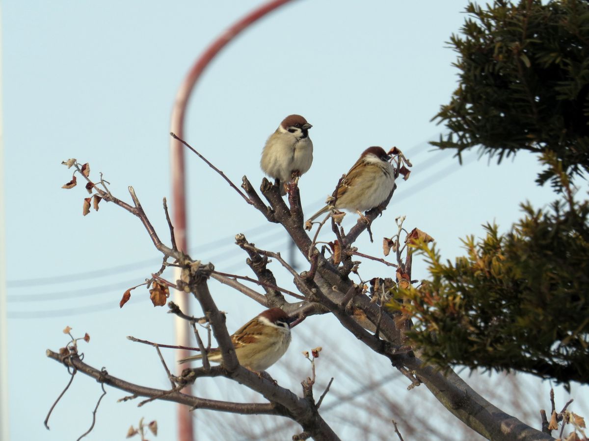 野鳥が少なくて寂しいので、駐車場に戻るときに、ショッピングモール近くの民家の庭でスズメを撮影しました。(写真6〜9)