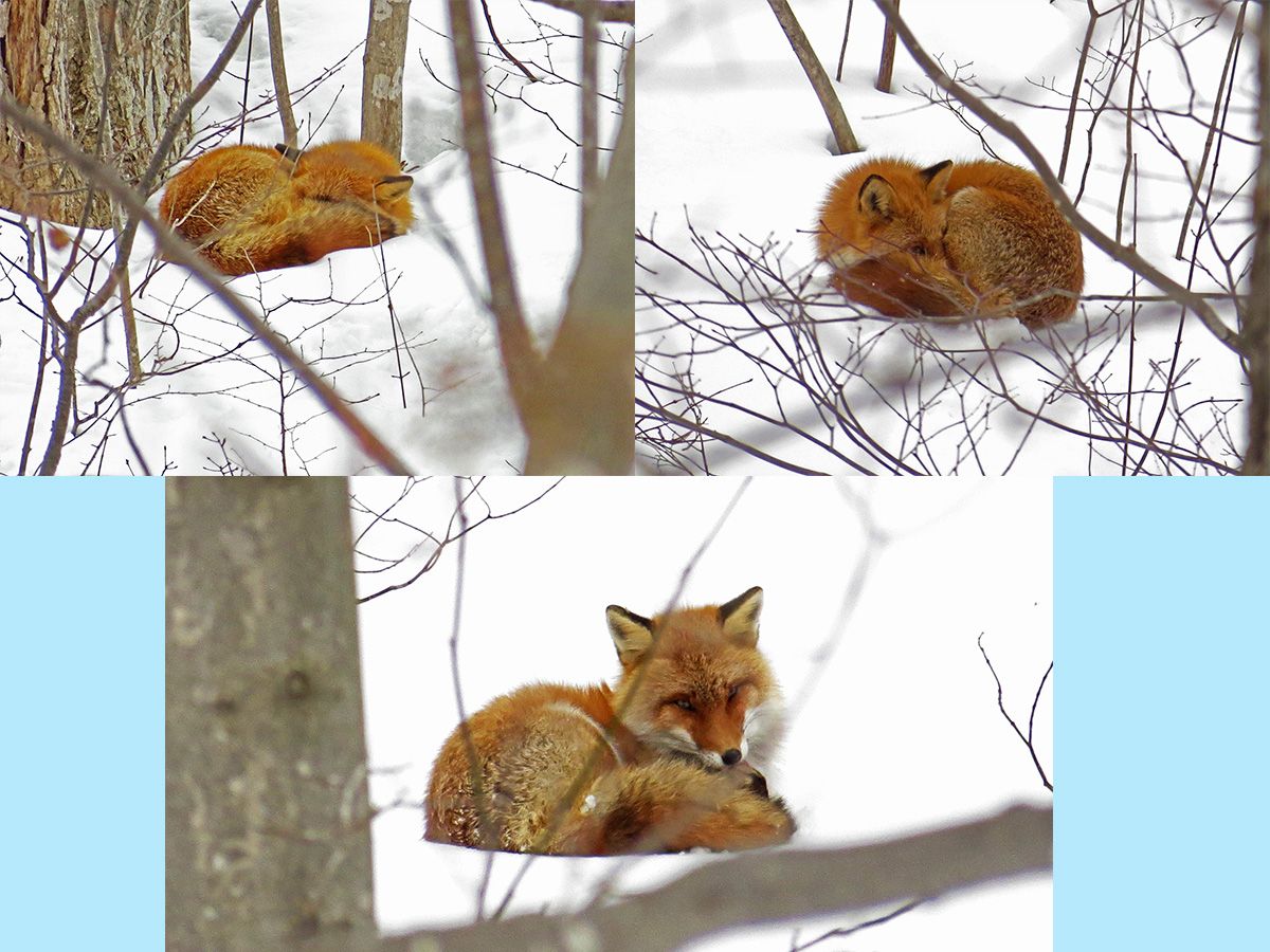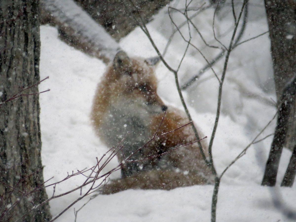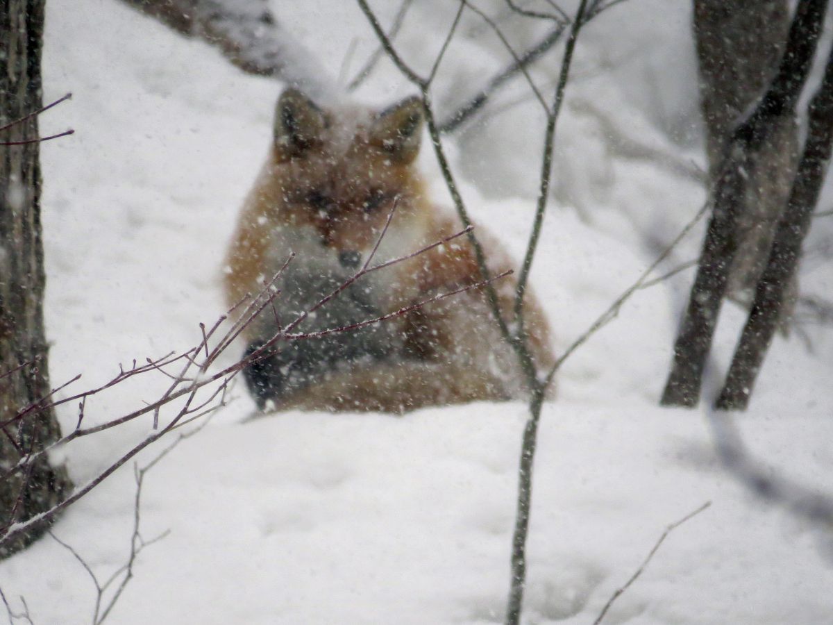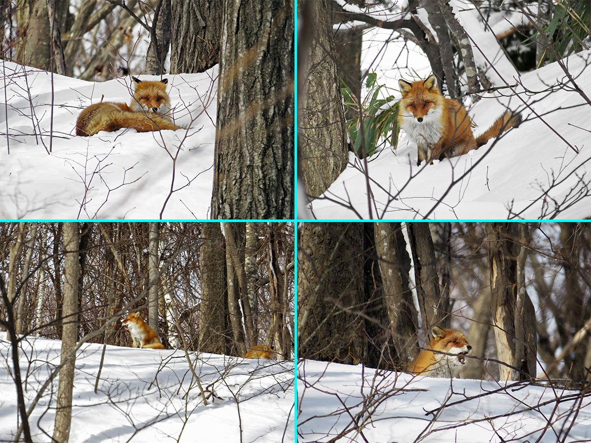 この雪の中で、キタキツネ一匹が斜面で休憩をしていました。(写真1〜2)