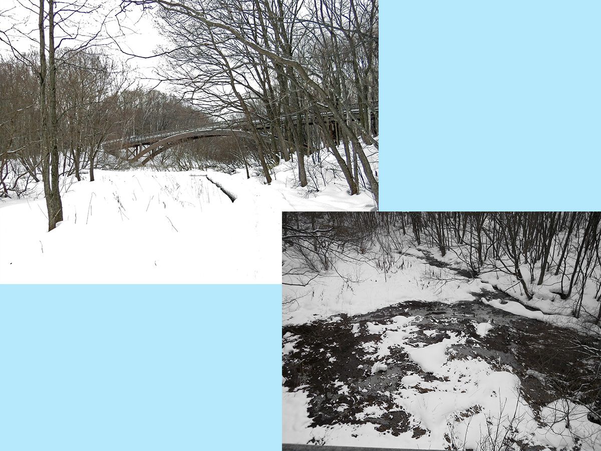 梅の香橋下の湿原では、雪の消えた部分が増えてきました。