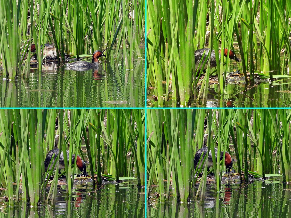 人工池で撮影中に、芦の中に見なれない物が見えました。