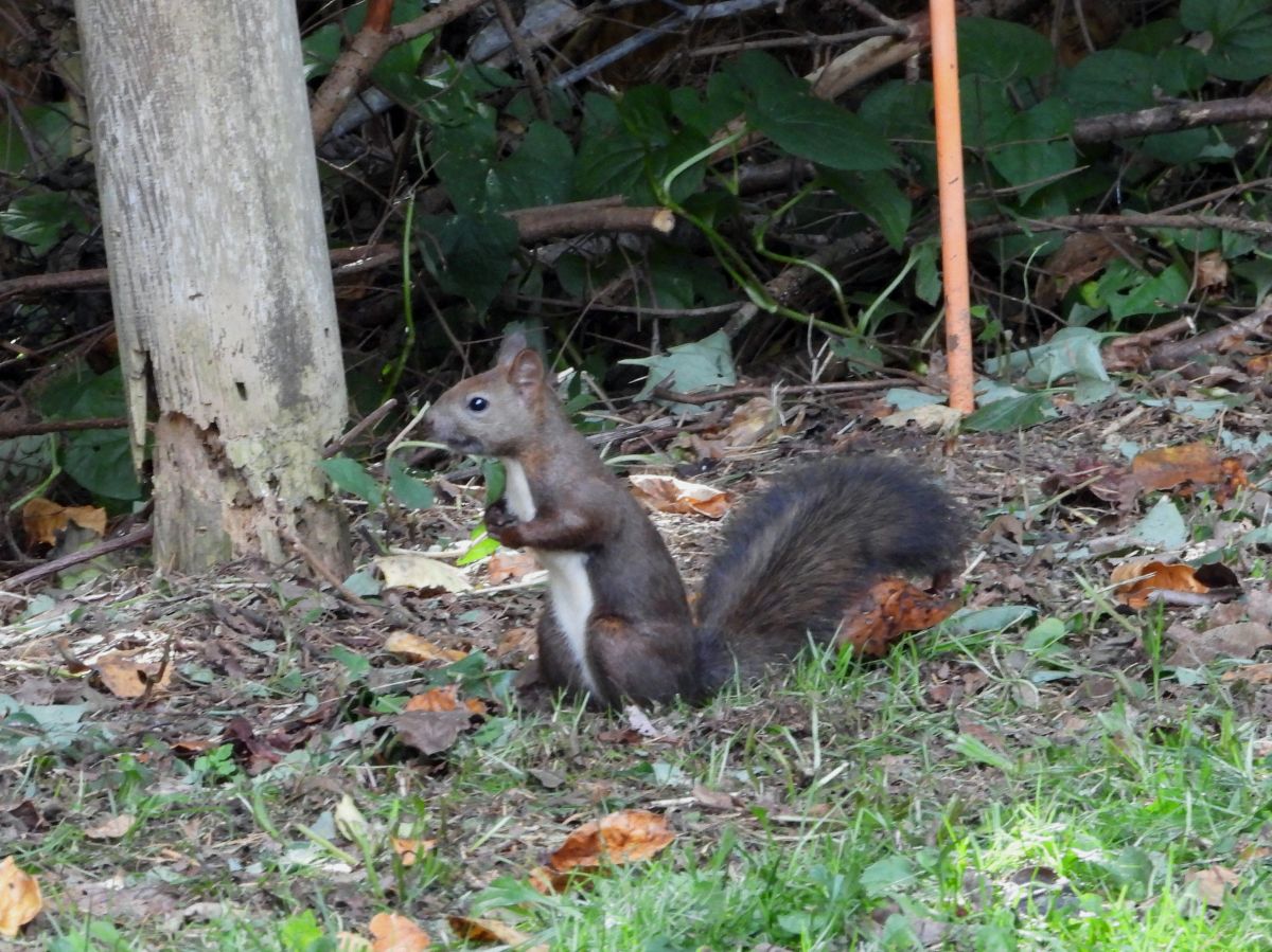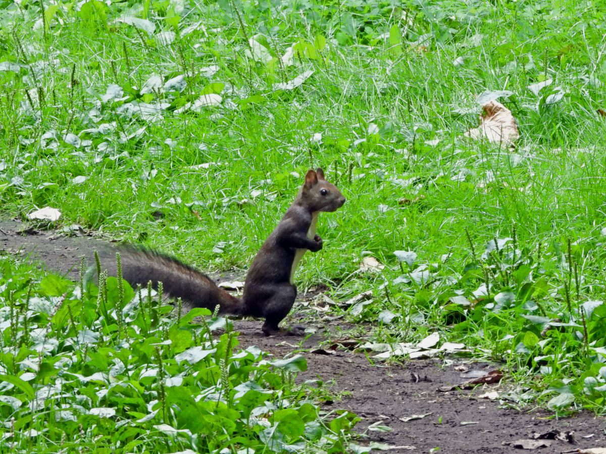 広場の遊歩道を歩いているときに、遊歩道を走って横断するエゾリスを見かけました。