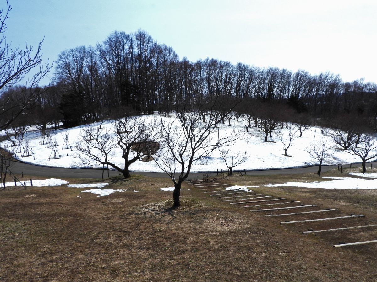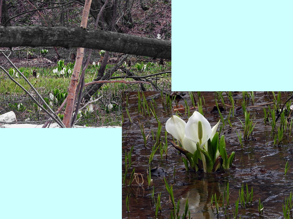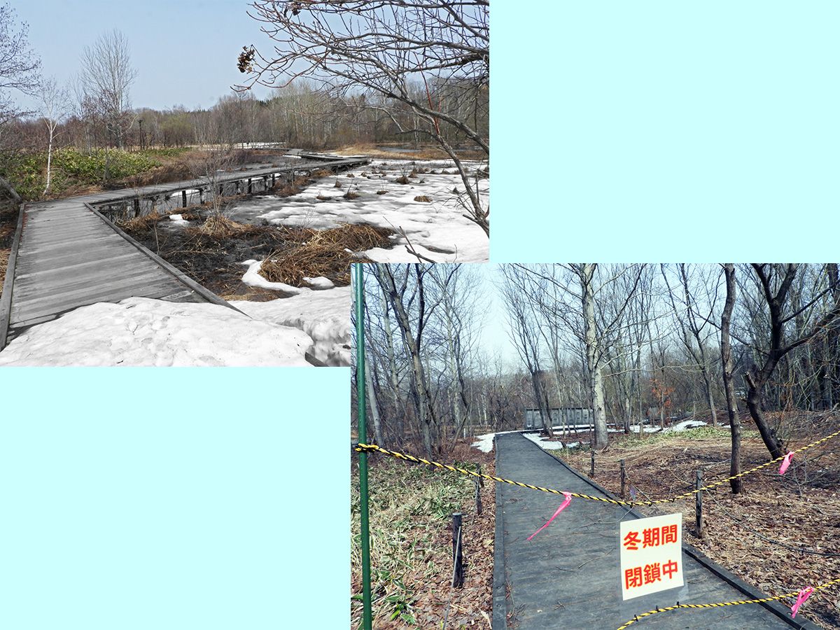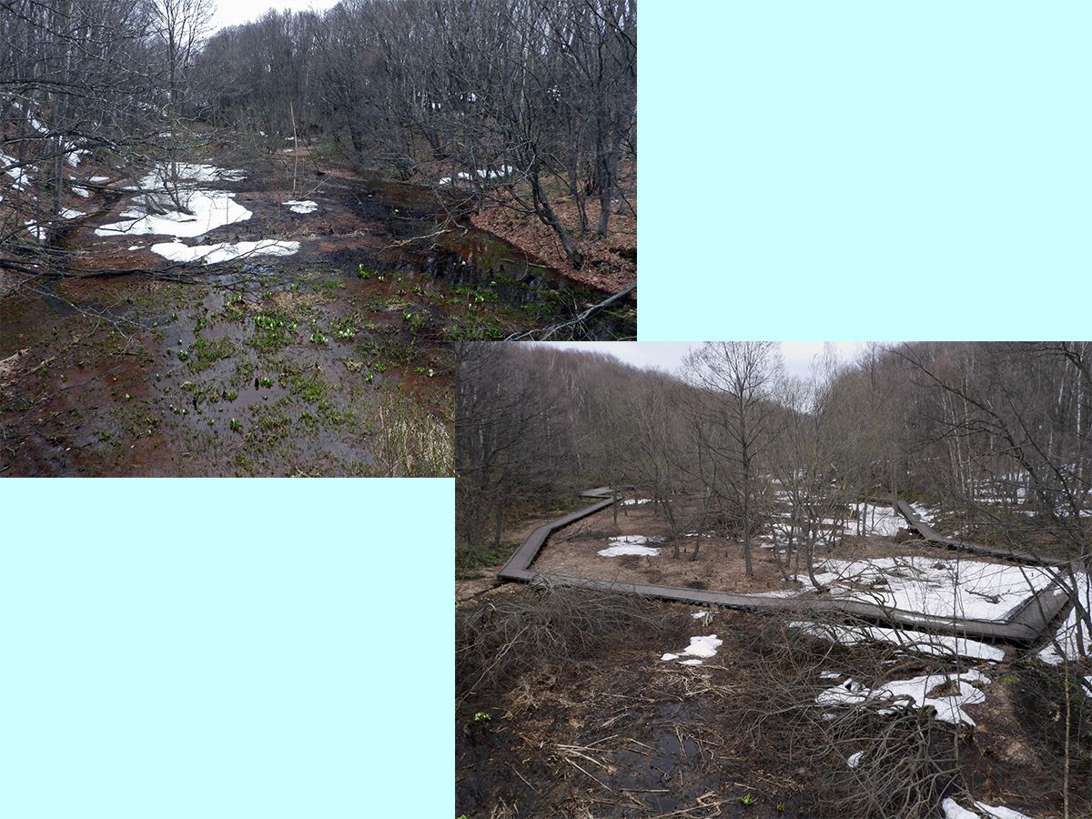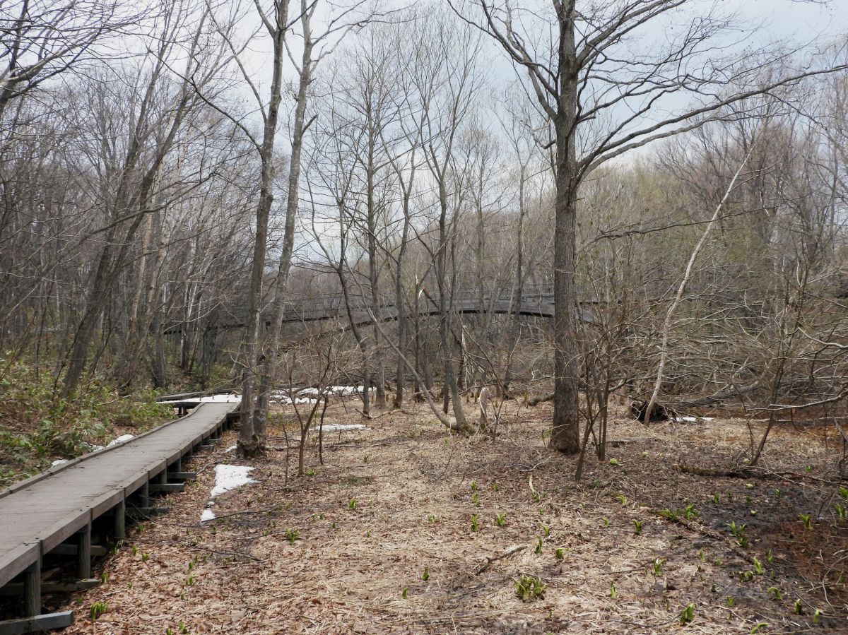 ただし、林のなかの木々は、梢部分が薄らと緑色になってきた程度で、湿原の木々とは葉の生長が大幅に遅れています。