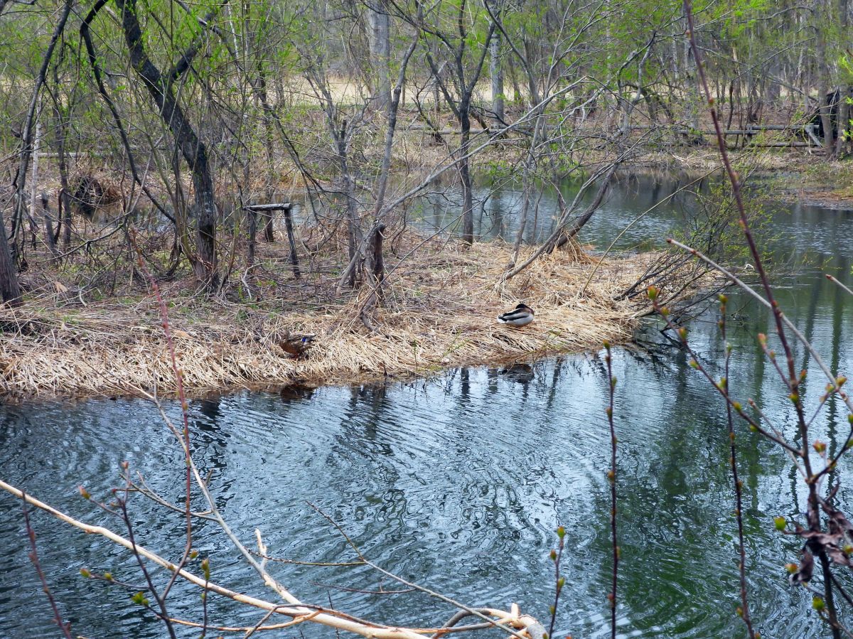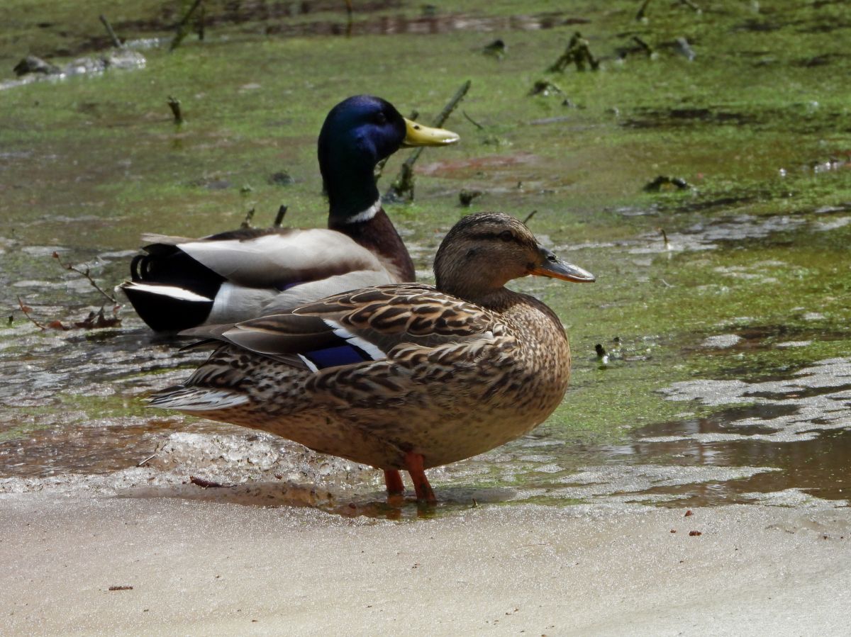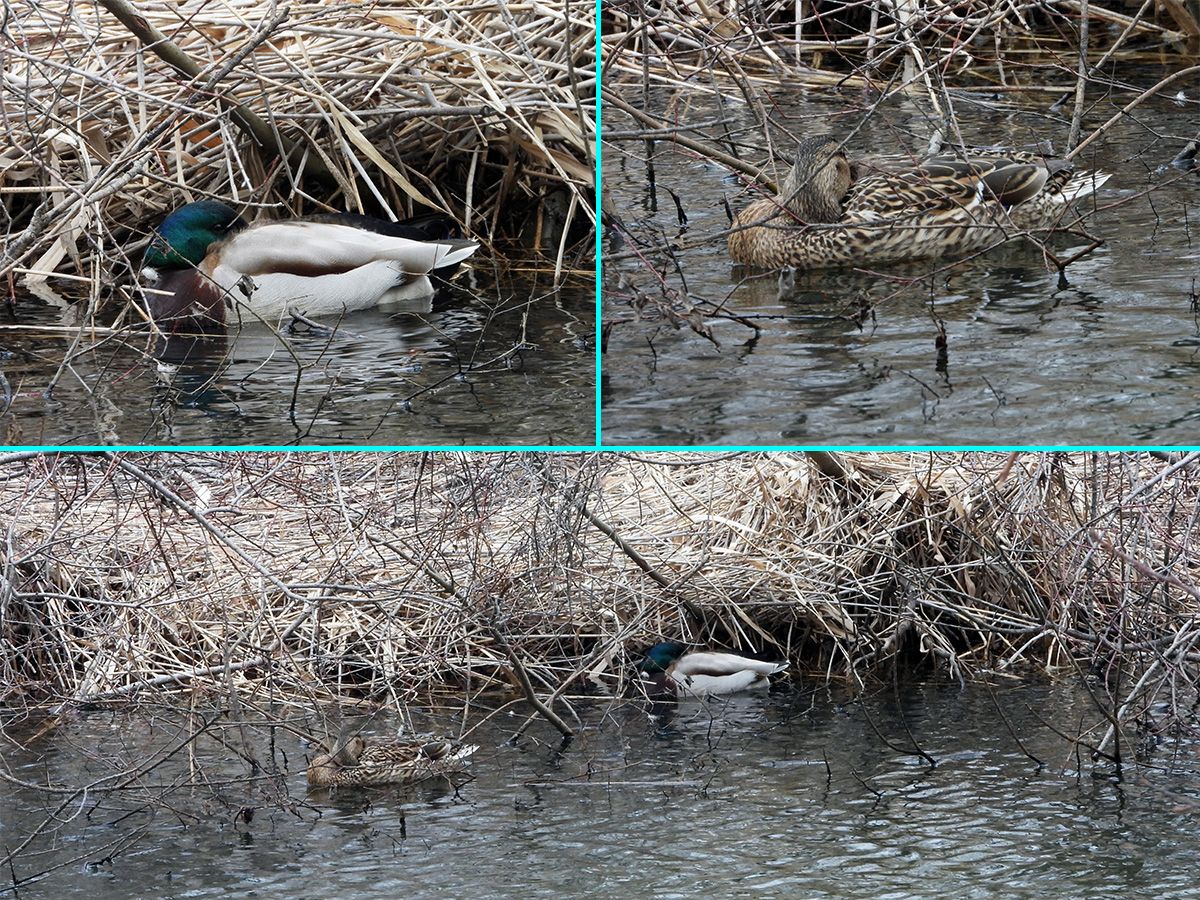 毎年人工池で子育てをしているマガモに注目していますが、今日はつがいで中島に上がっていました。(写真6〜8)