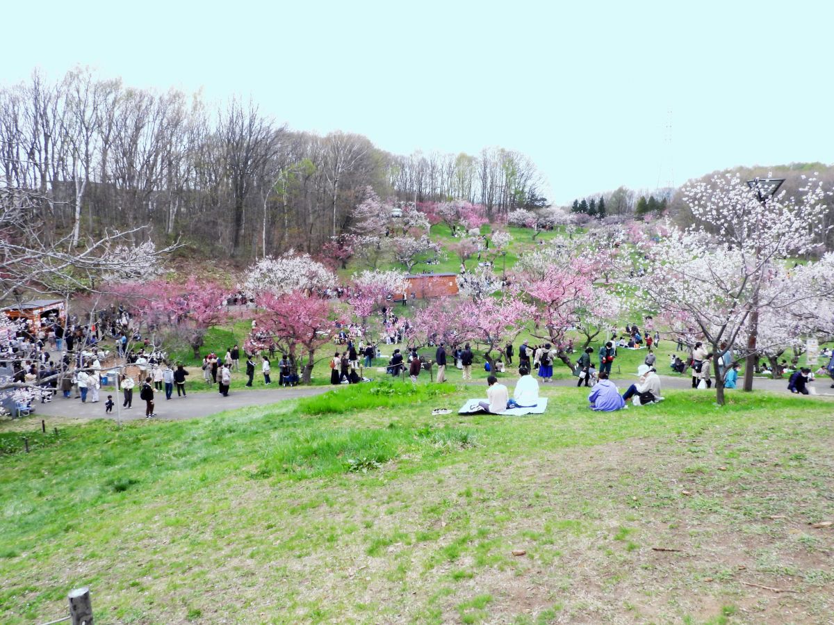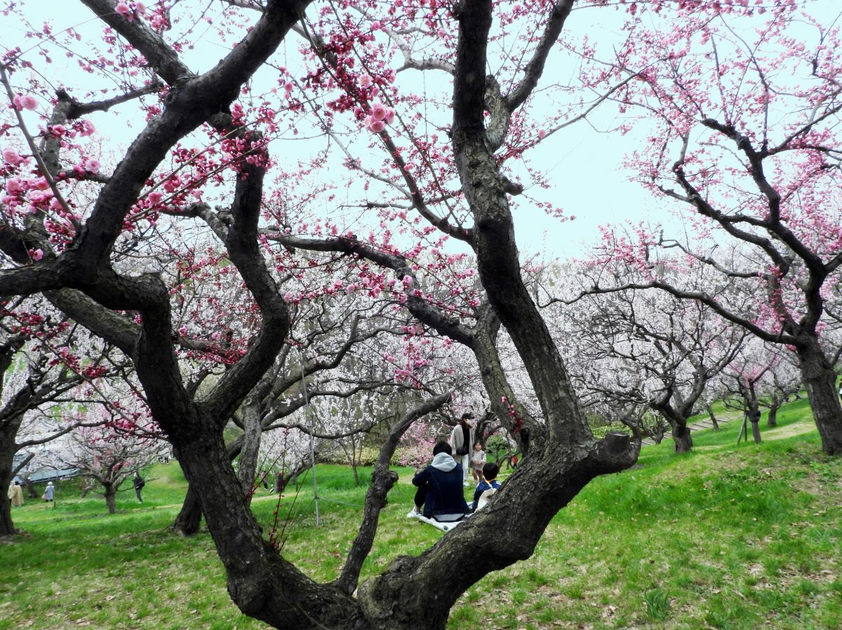 本日は祭日で絶好のお花見日和となりましたので、たくさんの見物客が平岡公園の梅園を訪れていました。