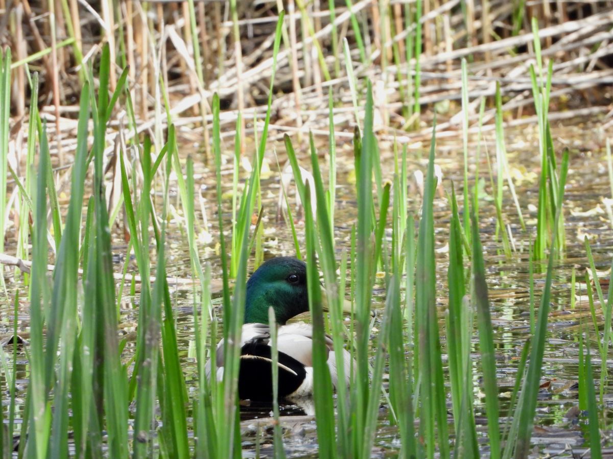 人工池ではマガモの雄が1羽採餌をしていましたが、撮影中に飛び去ってしまいました。(写真1)