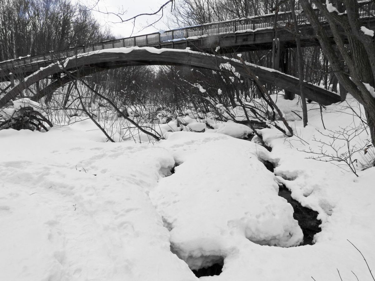 梅の香橋上の積雪が減ってきていますが、欄干に接している路盤の一部で積雪が消えています。(写真8)
