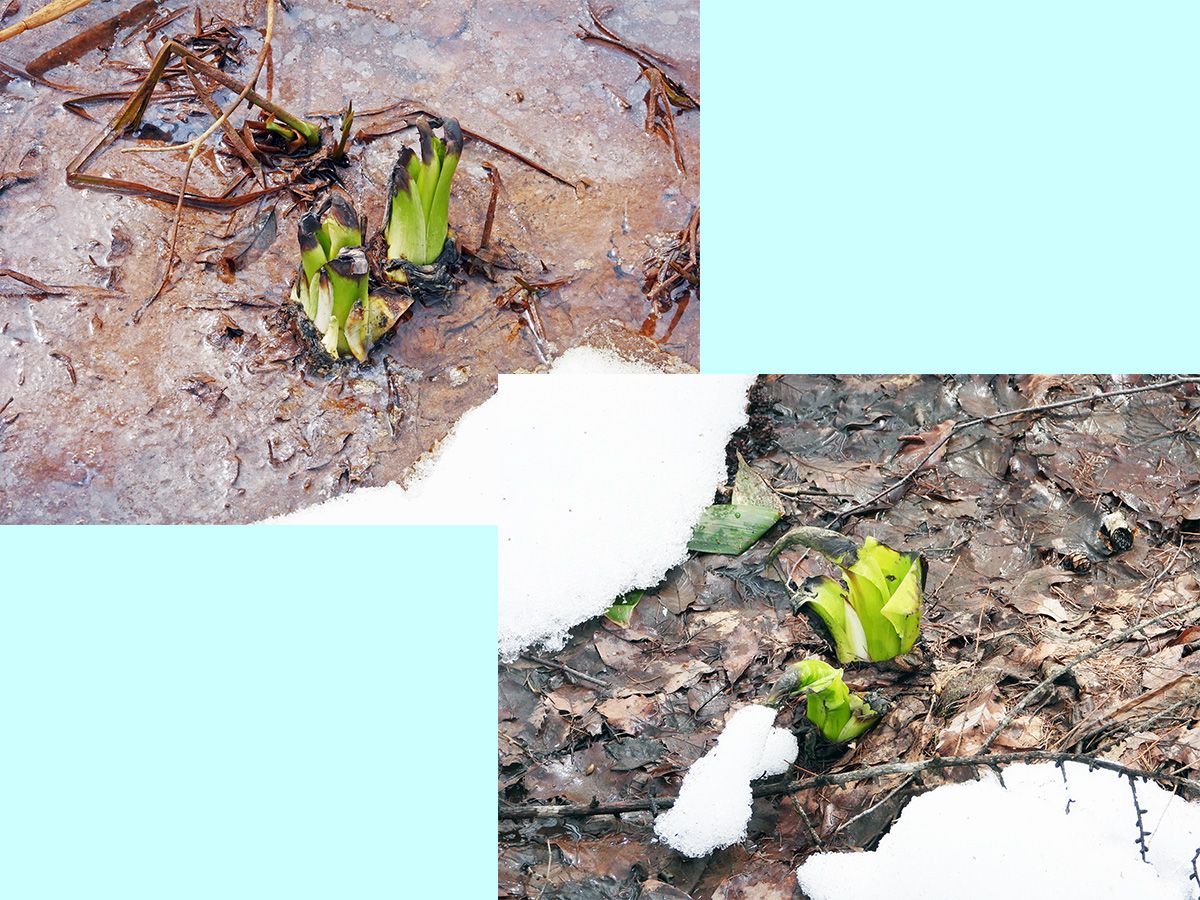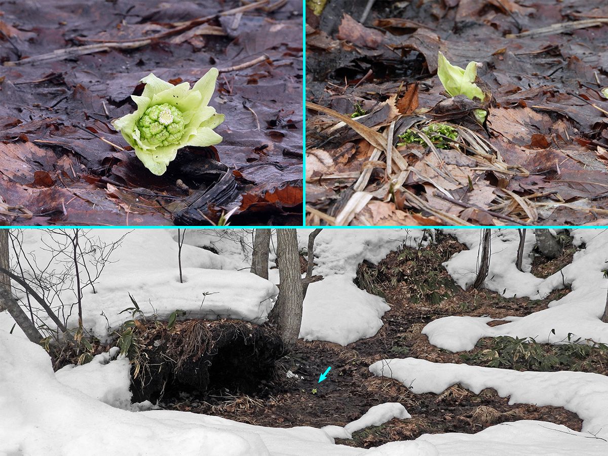 湿原の雪が消えた場所では、水芭蕉が姿を現しています。(写真8)