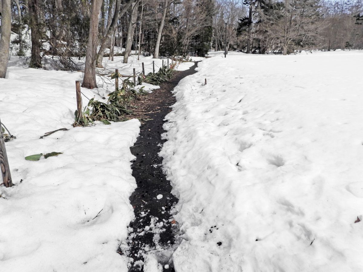 人工池に隣接する湿原の周りの遊歩道で、融雪進んで木の根元付近が出てきました。