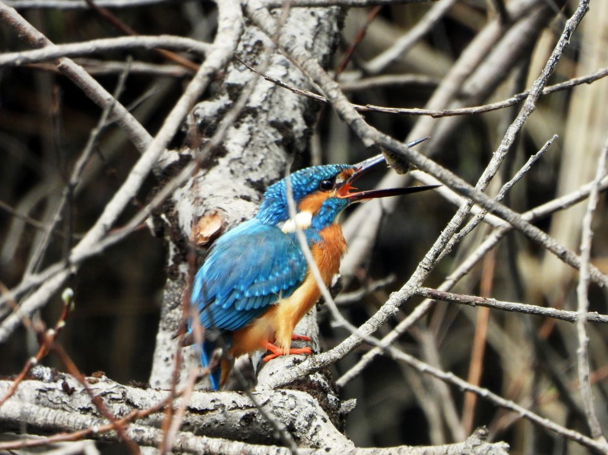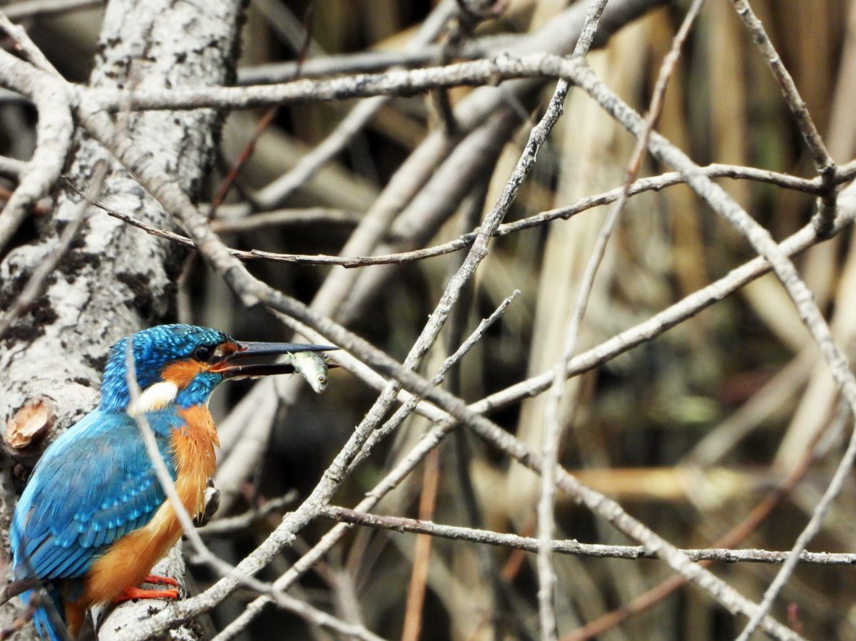 カワセミは、撮影の直前に小魚を捕らえていたようで、中島の木にとまって小魚をのみこみました。