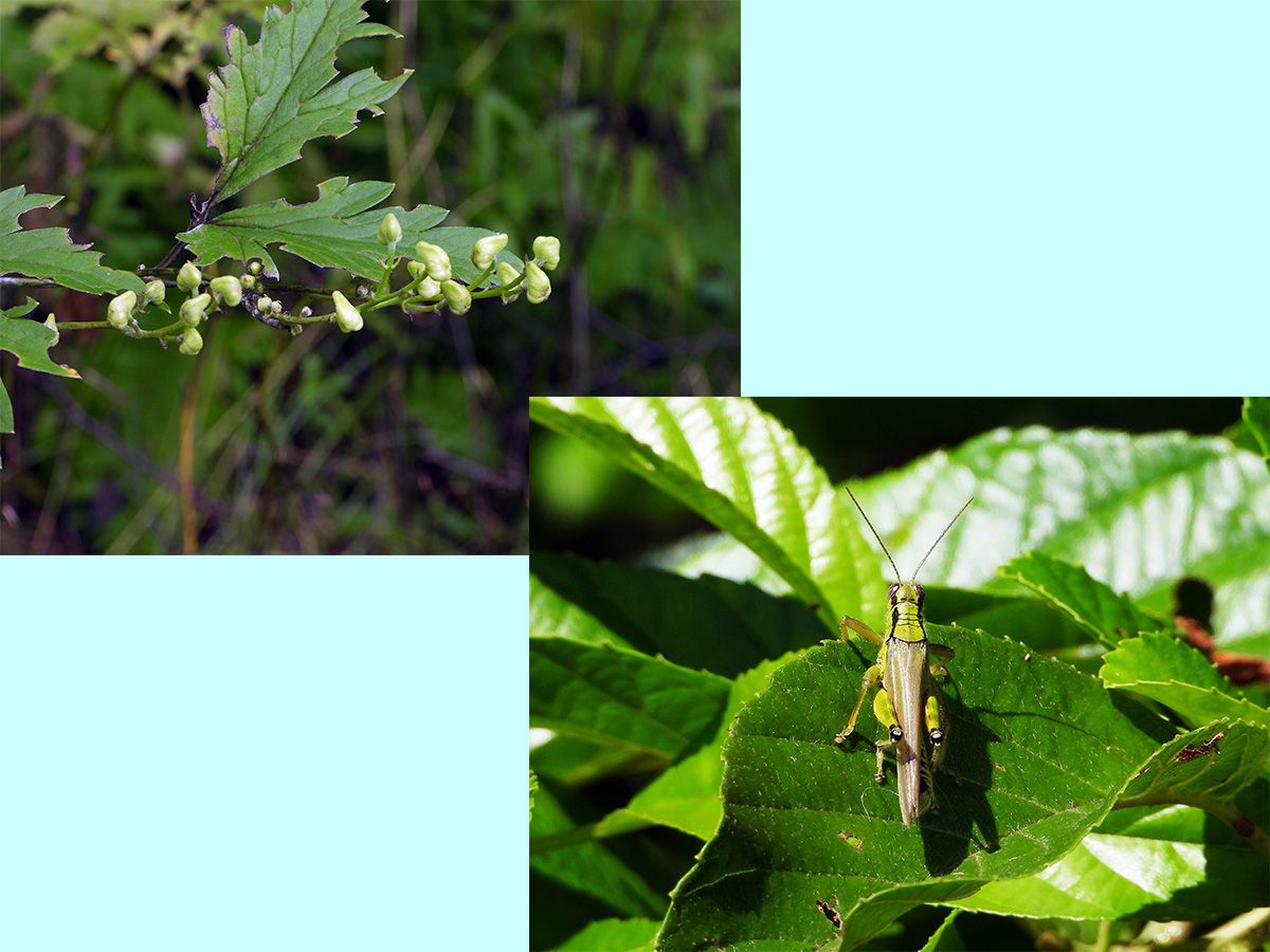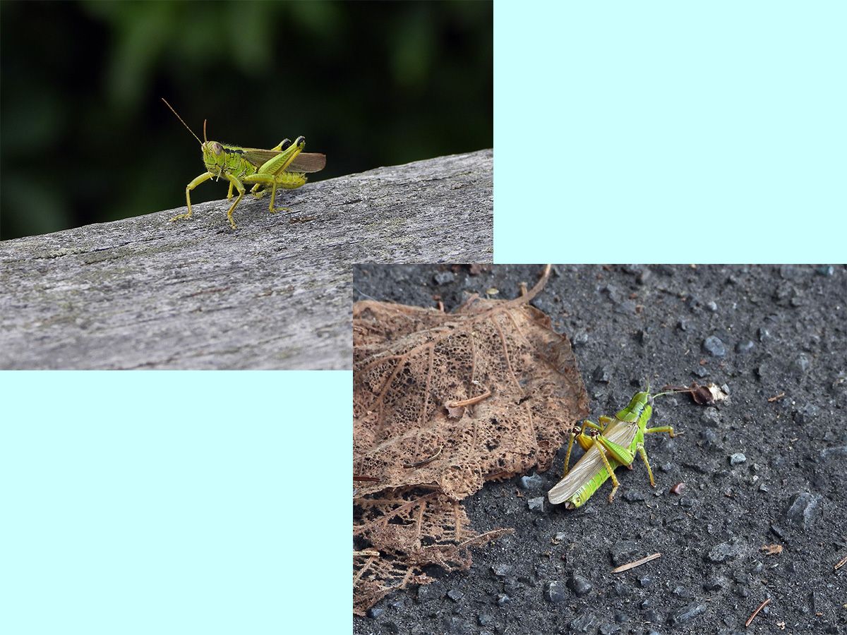 写真2:上段は、シャクナゲの子房ですが、普段あまり見かけない緑色の昆虫がいました。