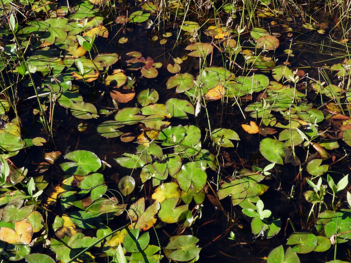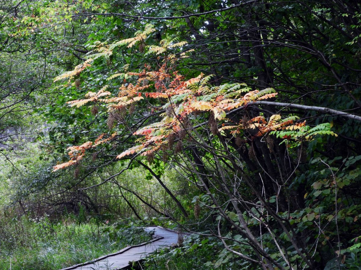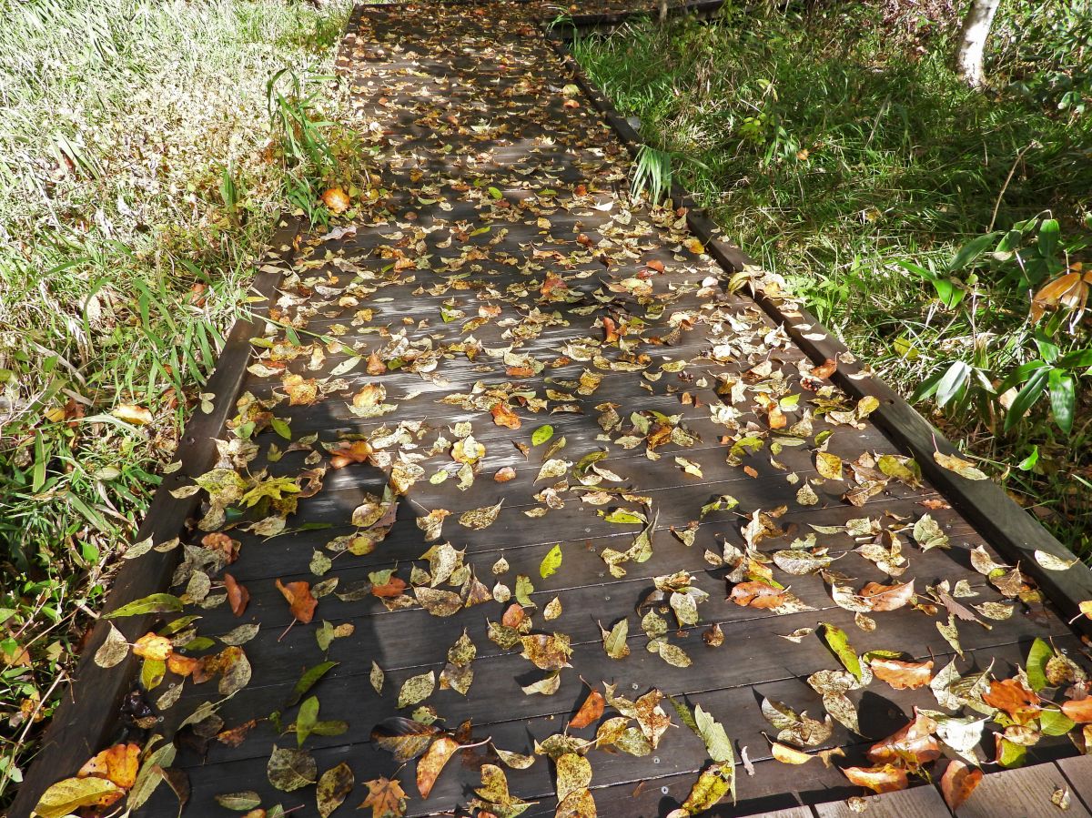 第一駐車場から湿原に降りる急な階段では、真上にモミジの木があるので、いま現在落ち葉が大変素敵です。(写真5)