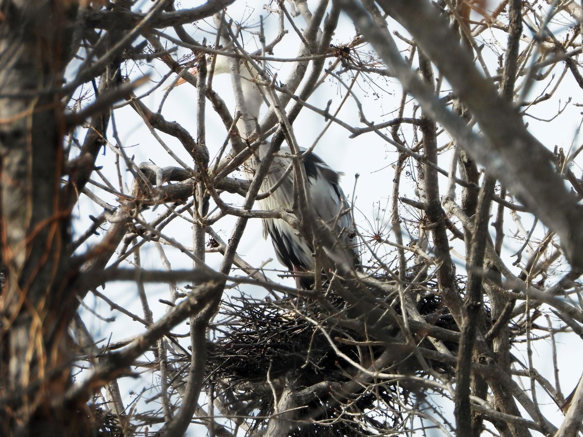 アオサギの巣は、高木の先端近くにつくられていますが、小枝を積み上げた程度の簡単な造りで、吹きさらし状態です。