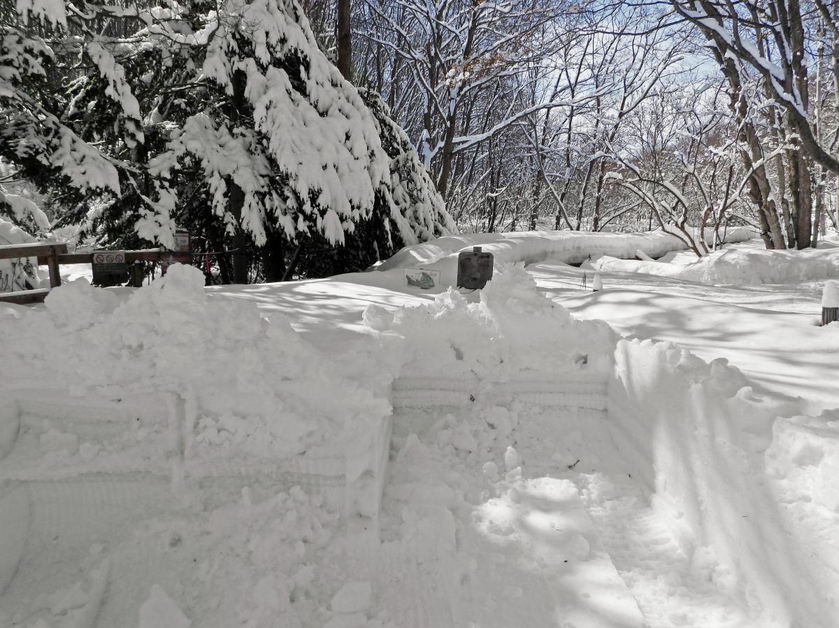 第一駐車場に冬期間設置される除雪センターは、すでに業務を終了しており、今日は駐車場の機械除雪が行われていました。(写真1)