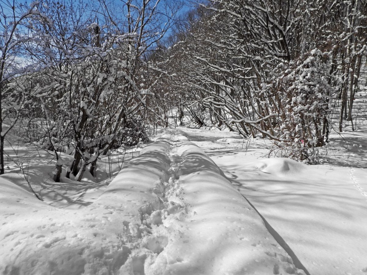 木道も、陽当たりの良い部分では、木道の両側の雪が落ち、両側に幅10〜15cm程度雪が消えている部分も現れました。