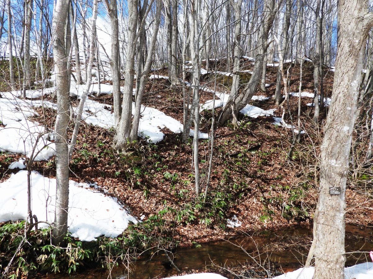 梅の香橋付近の湿原で、雪に隠れていた水芭蕉が姿を見せはじめました。(写真6)