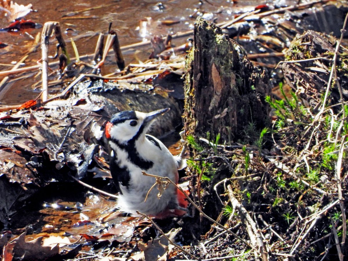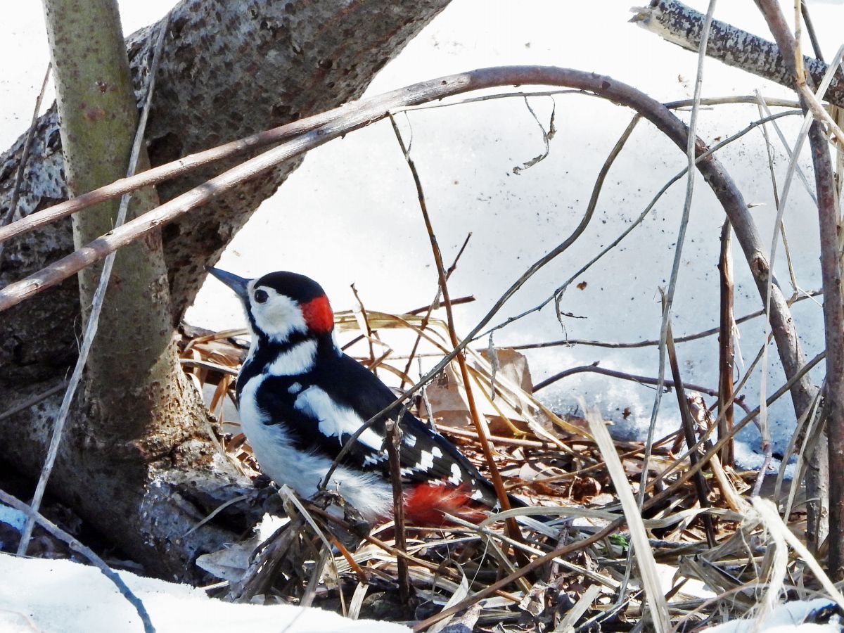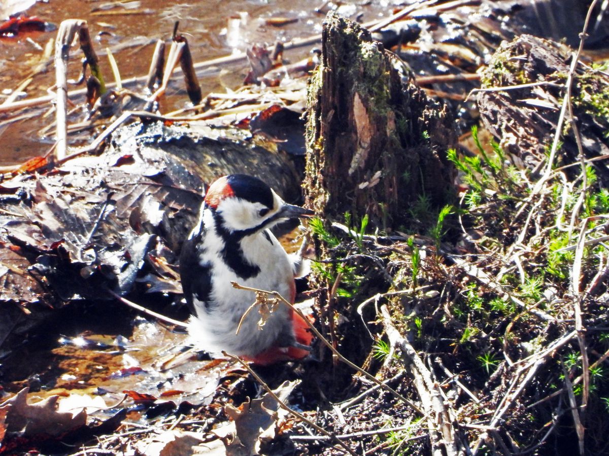 最後に、梅の香橋の上から湿原を観察しているときに、採餌中のアカゲラを発見しました。(写真5〜9)