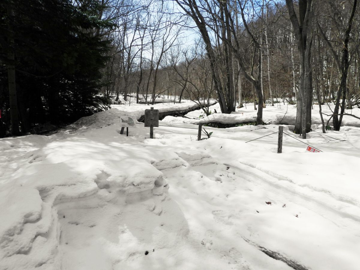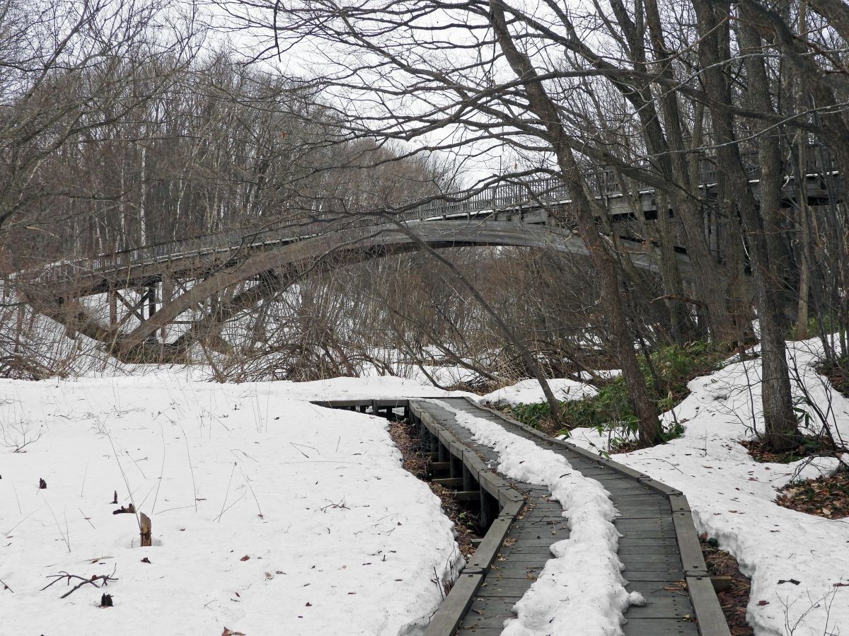 人工池に続く木道も、だいぶ雪が少なくなりましたが、湖面はまだ確認できませんでした。(写真4)