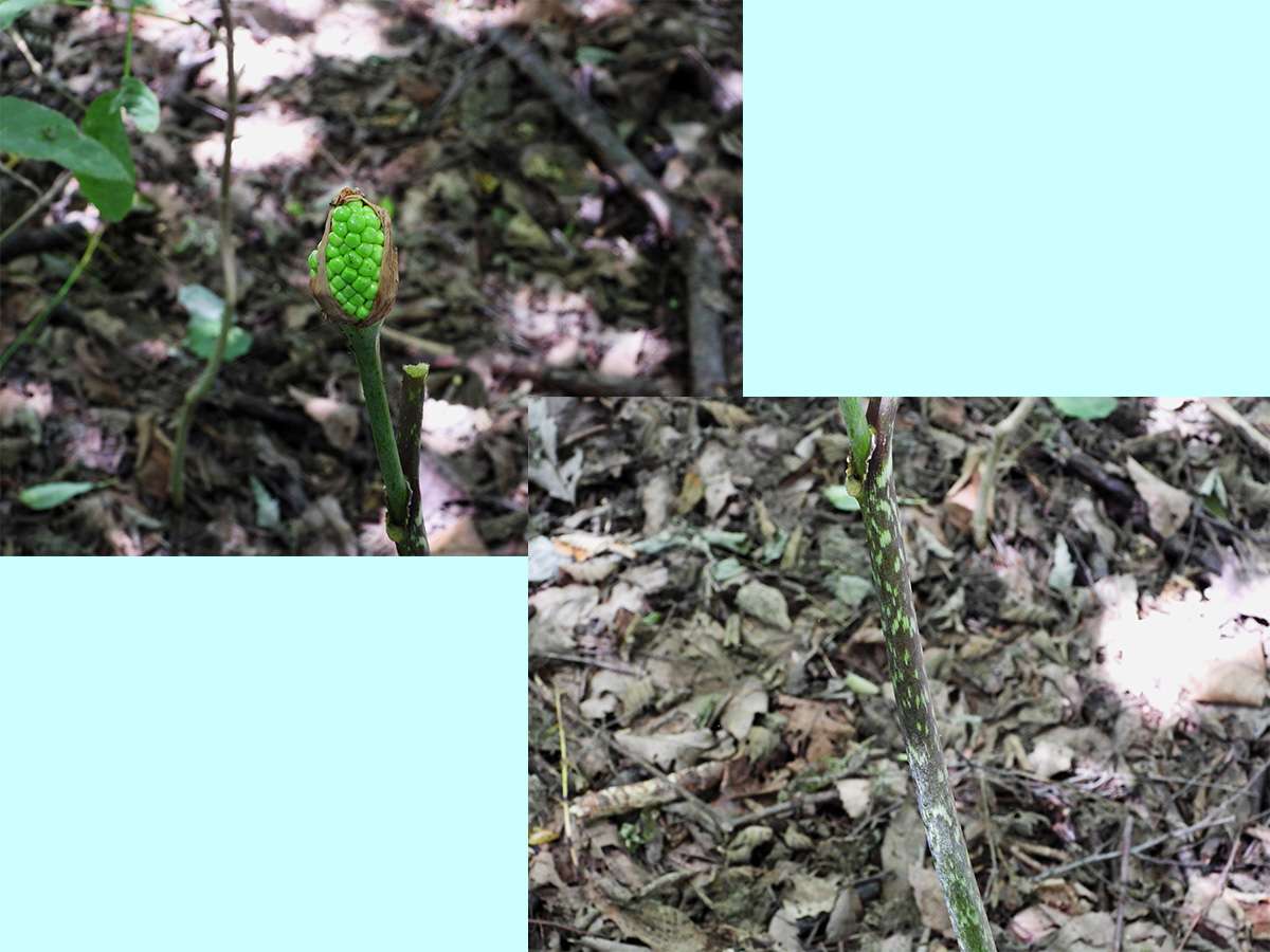 ハナショウブに似た花が終了して、子房が成長して種子がはじけそうになりました。(写真9:上段)