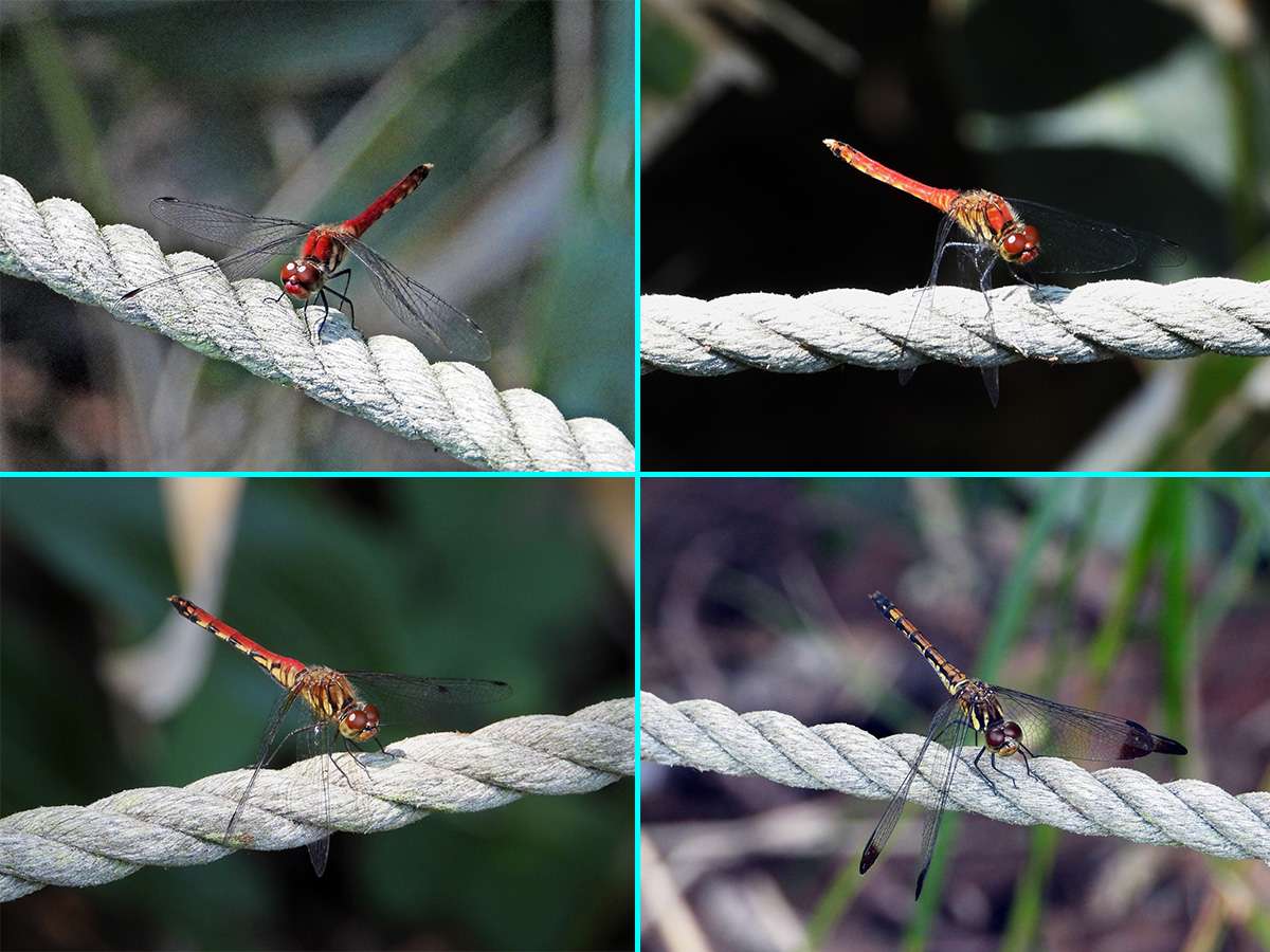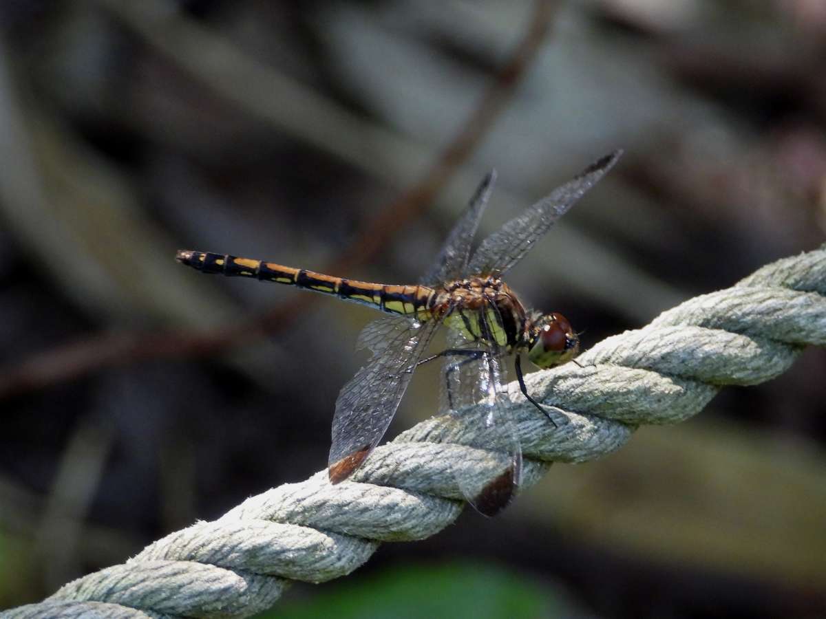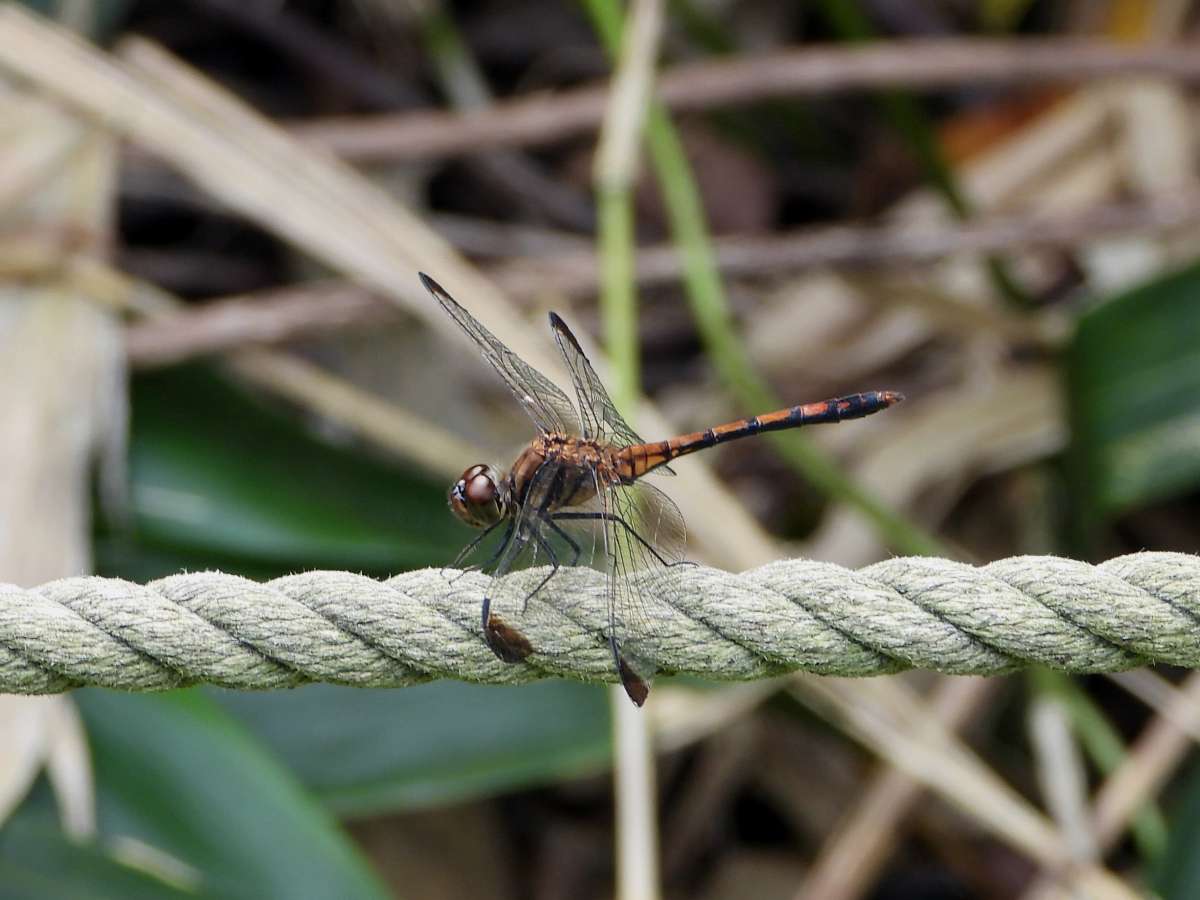 ロープや植物の茎の先端などで、多数のトンボが羽根を休めています。