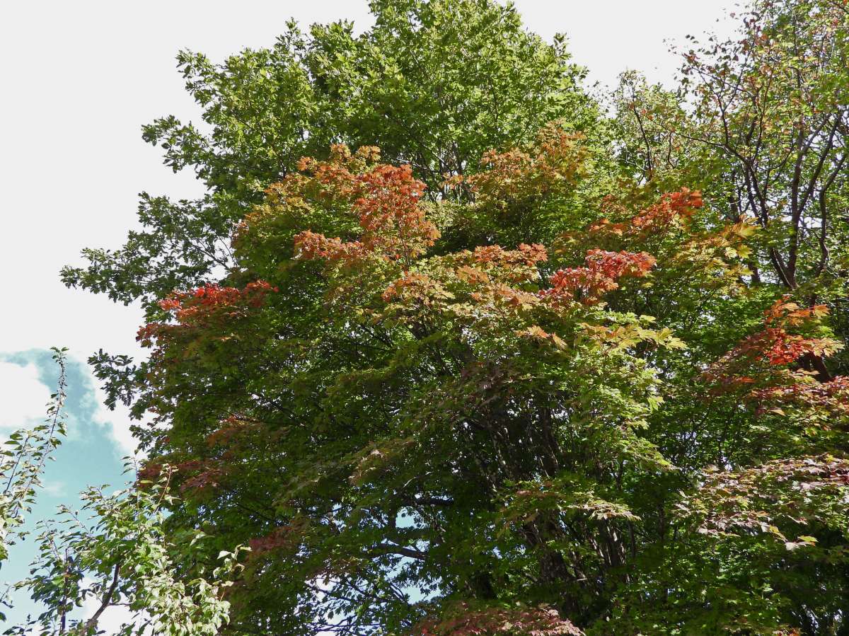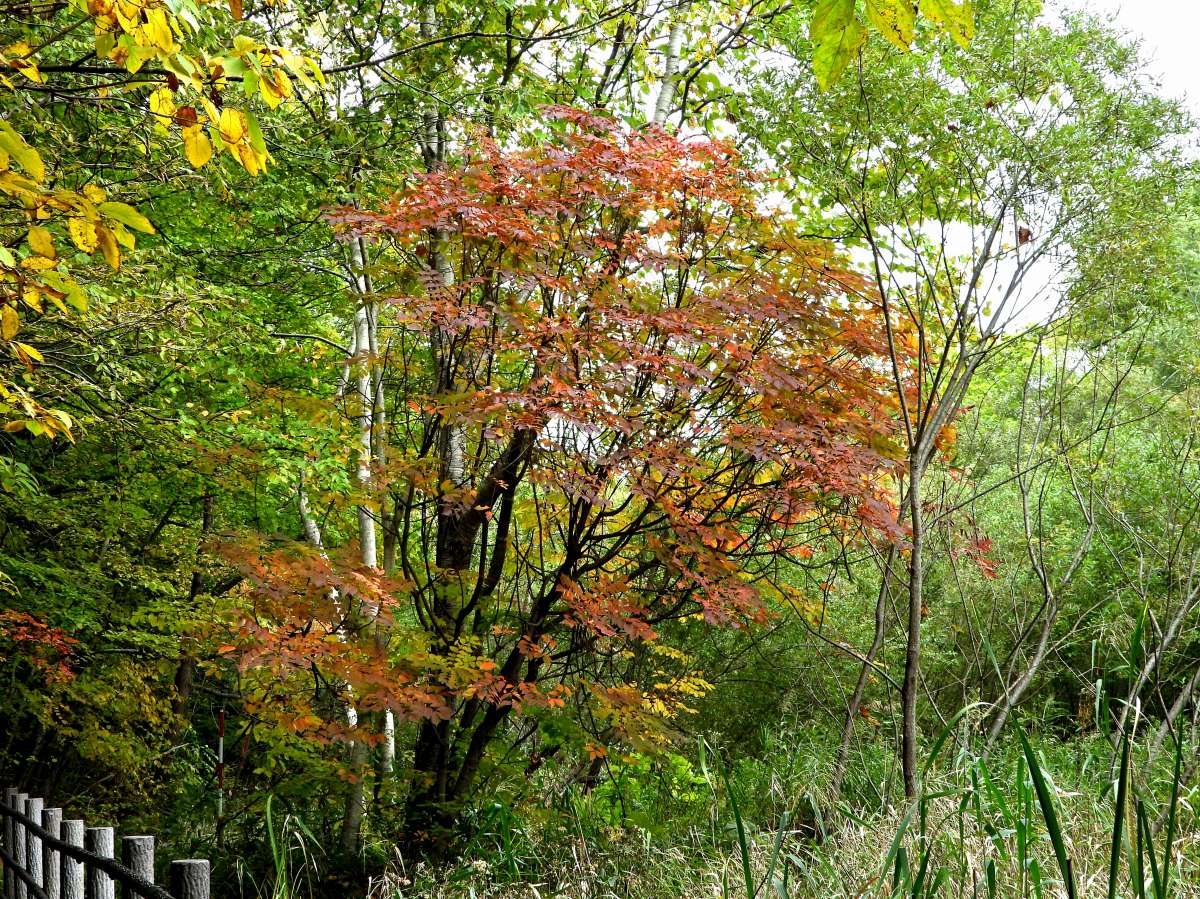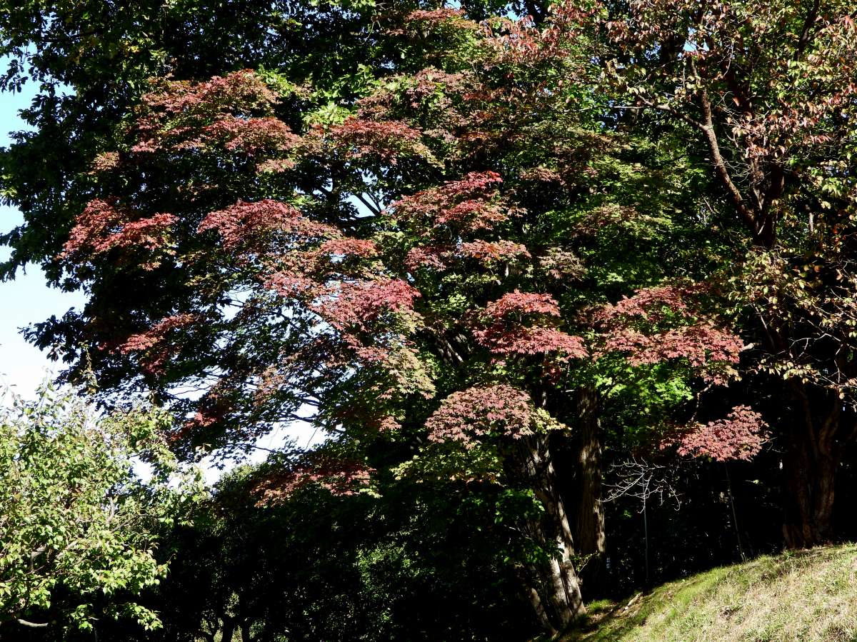 梅の香橋のそばには紅葉の樹が数本あり、まだ全体的には緑色が優勢ですが、一部分が紅葉しはじめました。(写真6)