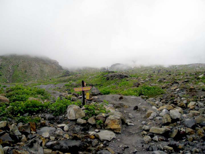 美瑛岳山頂到着時点でも、山頂は完全に雲の中で視程は全く不良でした。