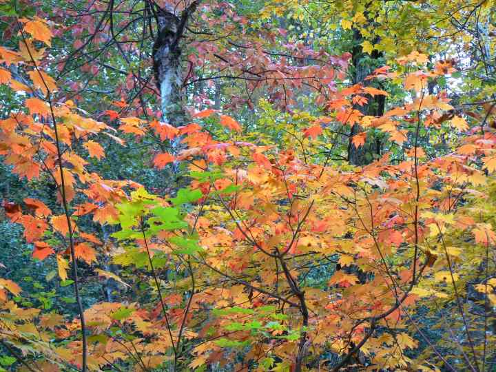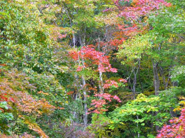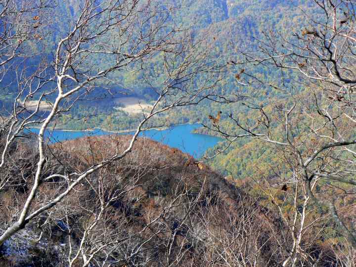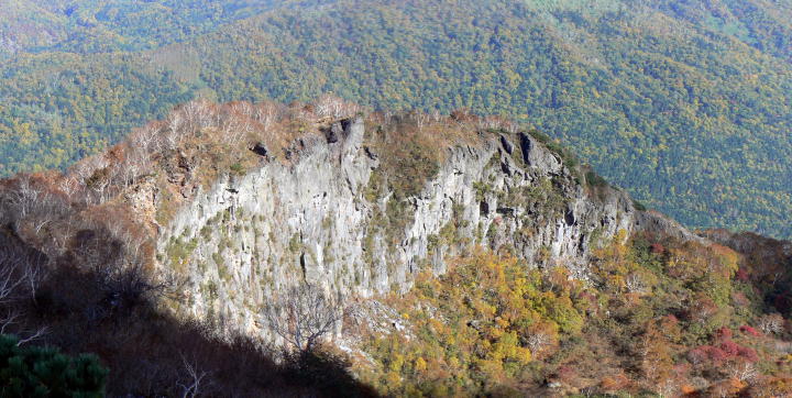 紅葉は既に平地に降りてきており、駐車場の沢を挟んだ向かい側斜面の紅葉が最高でした。山頂から見える山腹の紅葉は既に最盛期を過ぎているようでした。