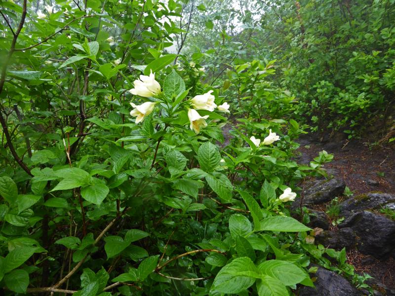 中腹以上は濃い霧に入り、霧が木の葉で結露して風が吹く度に雨のように降りかかるようになりました。