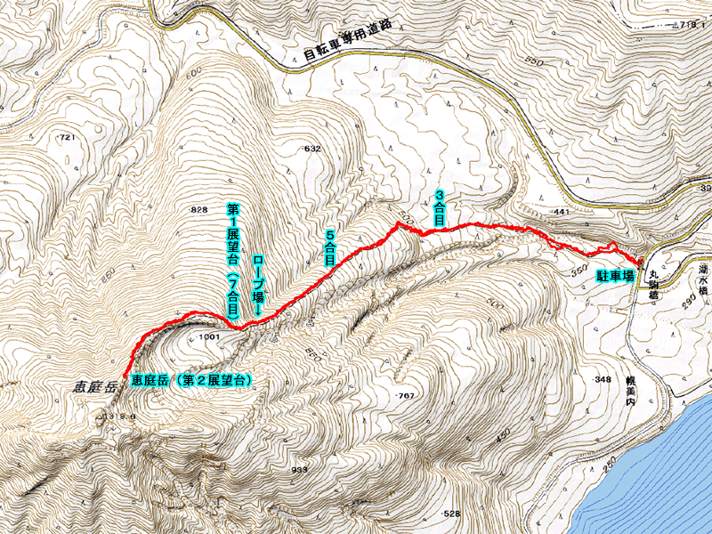 往路のロープ場は、登り切った場所が、第1展望台の直ぐ下になります。