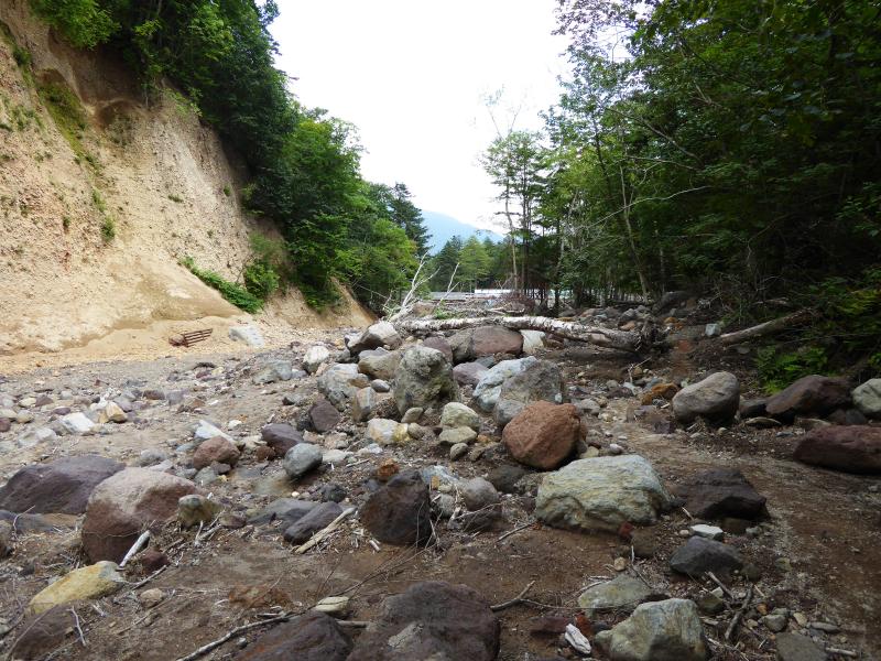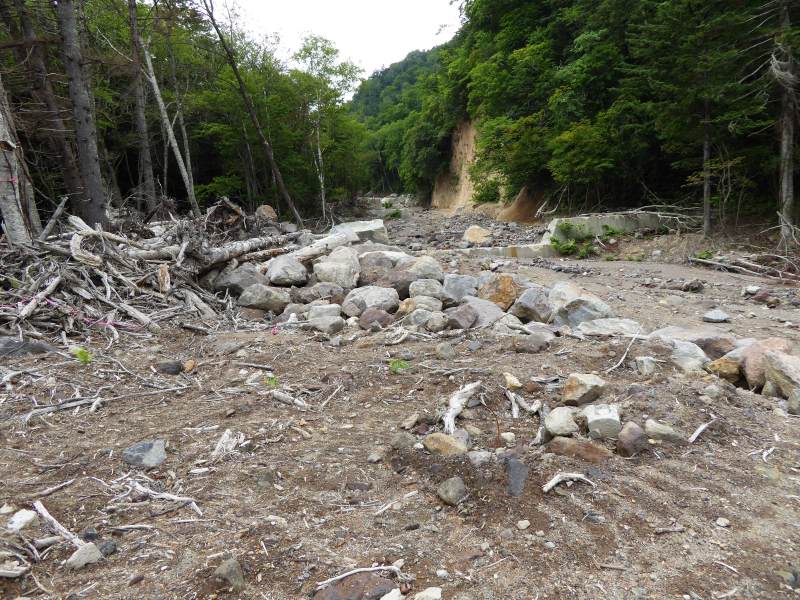 恵庭岳から流出した土石流跡は、国道の橋の下と手前が少し片付けられている以外は、手つかずの状態になっています。