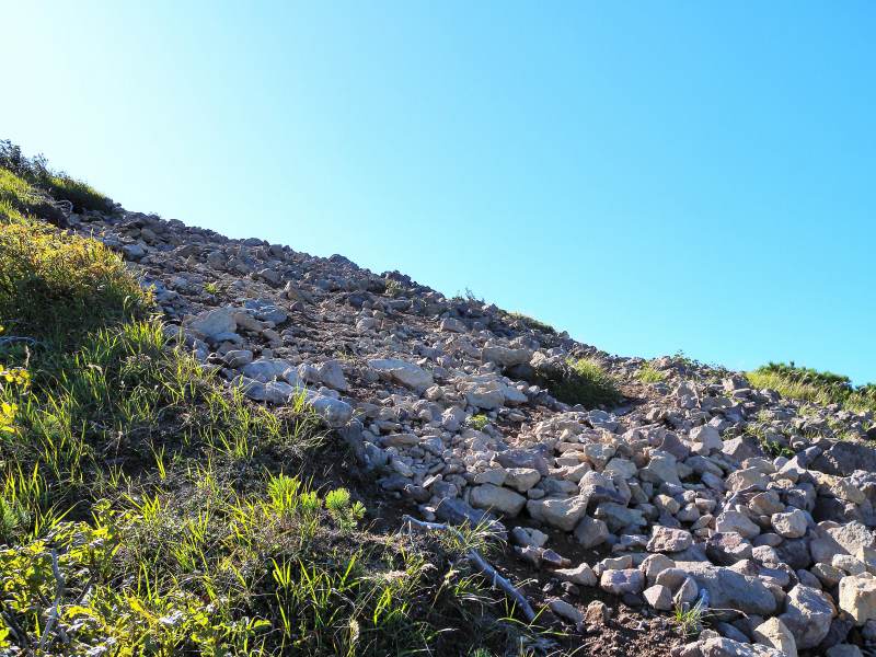 登山道には、先日の豪雨で流された草などが、所々でダンゴ状態になっていましたが、今回は小石まで流された形跡はありませんでした。