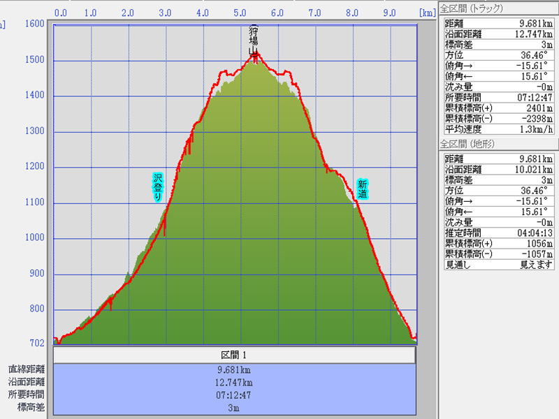 累積標高(+)は、沢登り中は(+、−)の高低差が大きく計測されているため、倍近い数値になっている。