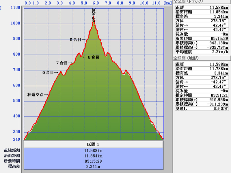 上昇量のみ約200m少ないですが、その他は藻岩山登山とほぼ同じです。