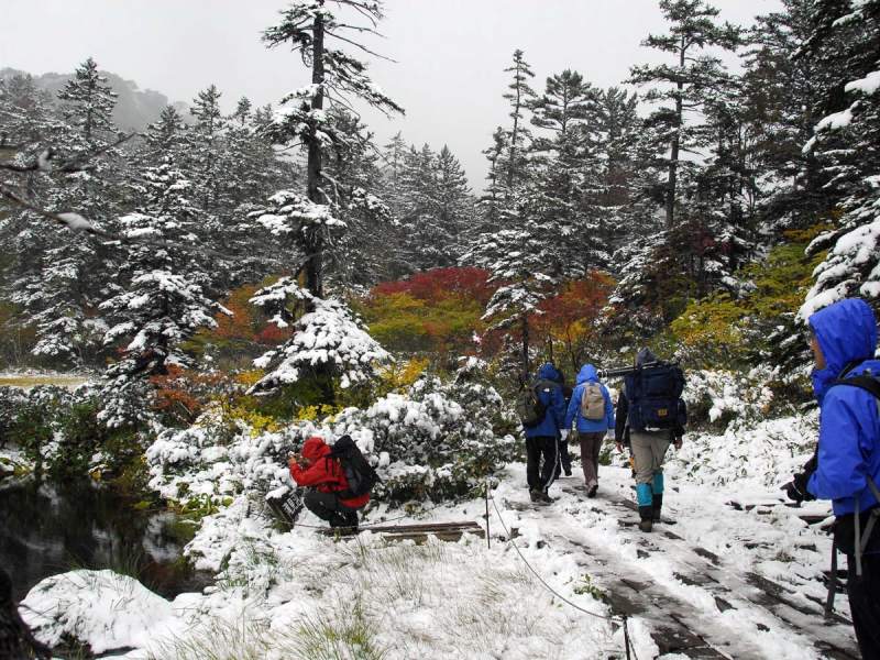 沼めぐりも、往路は登山道が雪道で、木道部分が滑りやすい状況でした。復路はその雪が融けたため、登山道が泥んこ状態になり、これまた大変歩きづらい状態になりました。